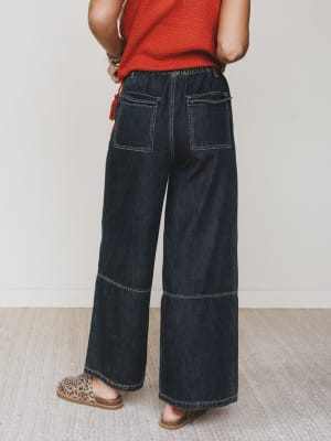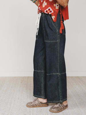 Easygoing, artsy, and effortlessly cool—these wide leg denim pants are made for dancing barefoot at festivals or wandering vintage markets with a coffee in hand. With a relaxed, wide-leg silhouette and utility-inspired stitching, they bring laid-back boho energy to any look.