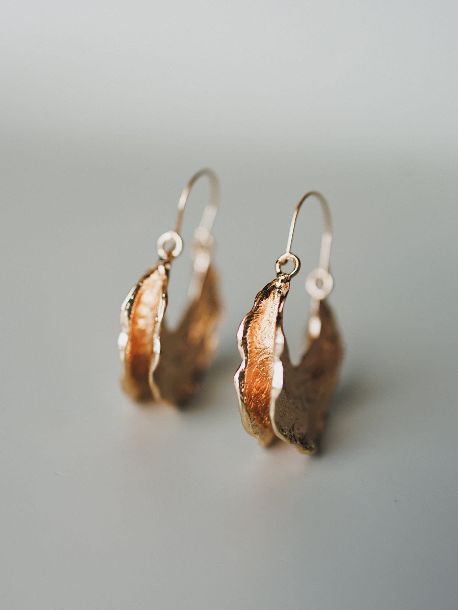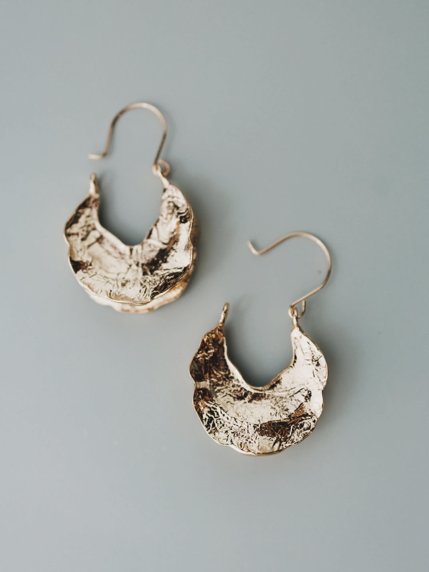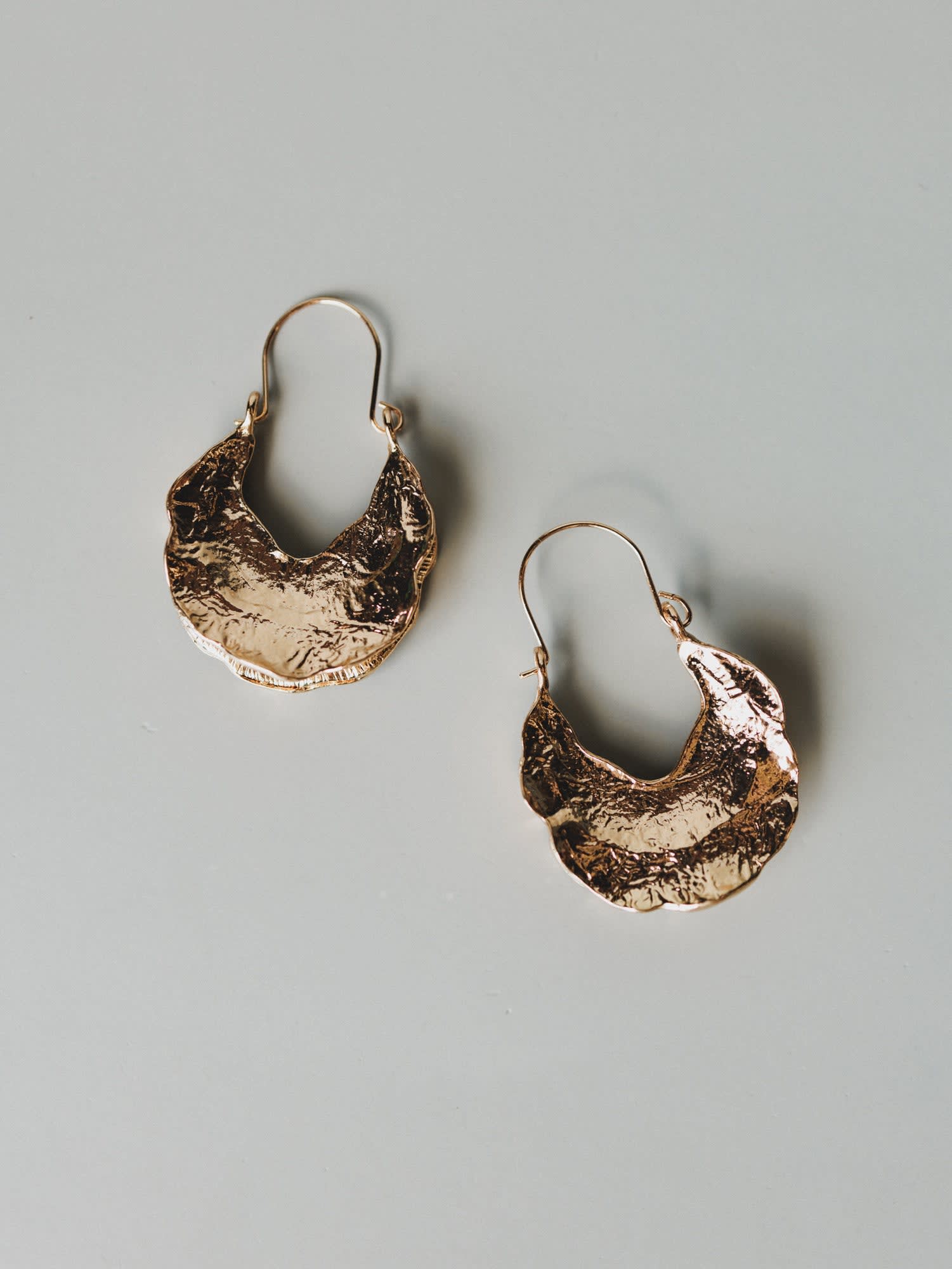 - Gold hammered crescent drop silhouette with a naturally textured, organic finish that catches light beautifully.