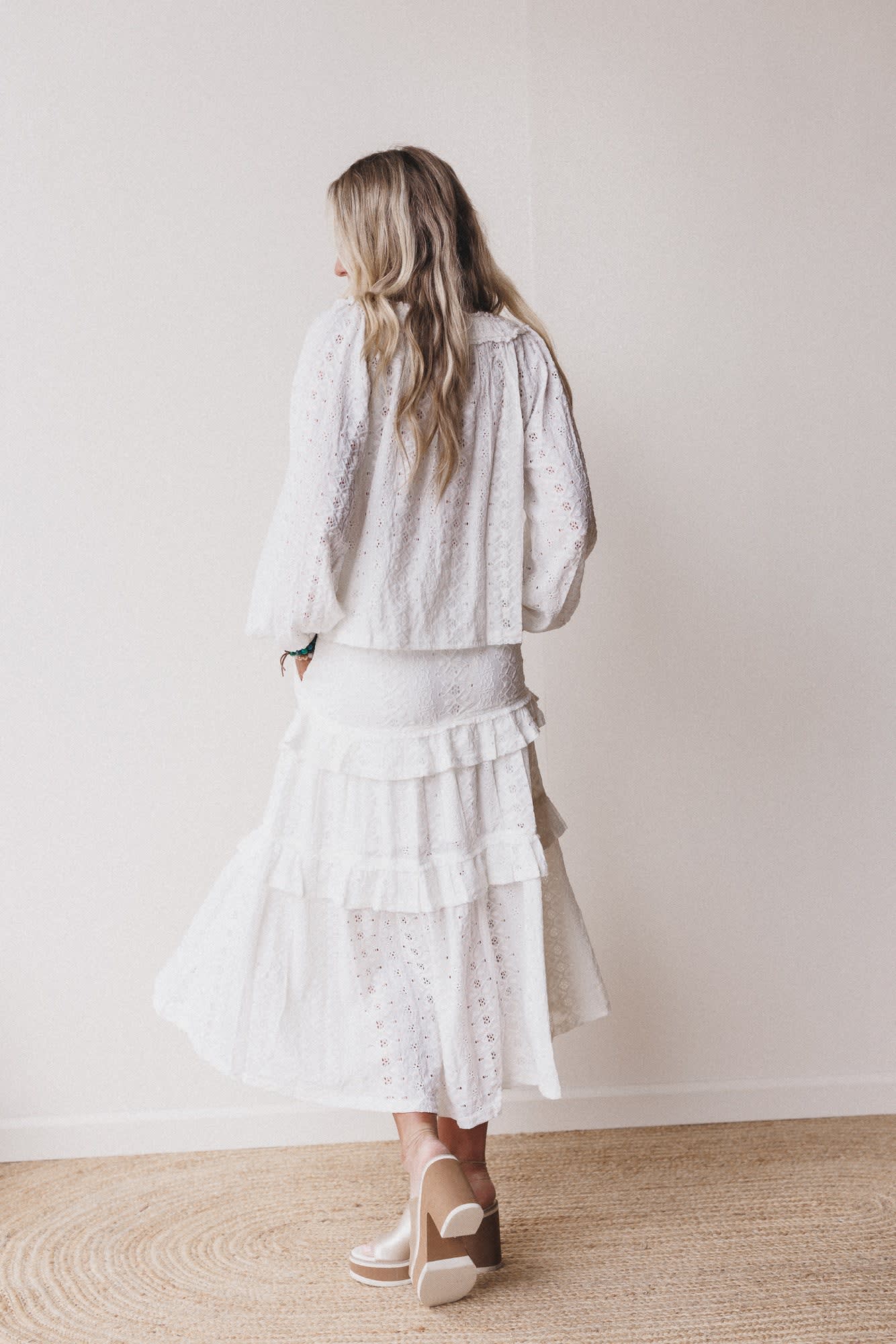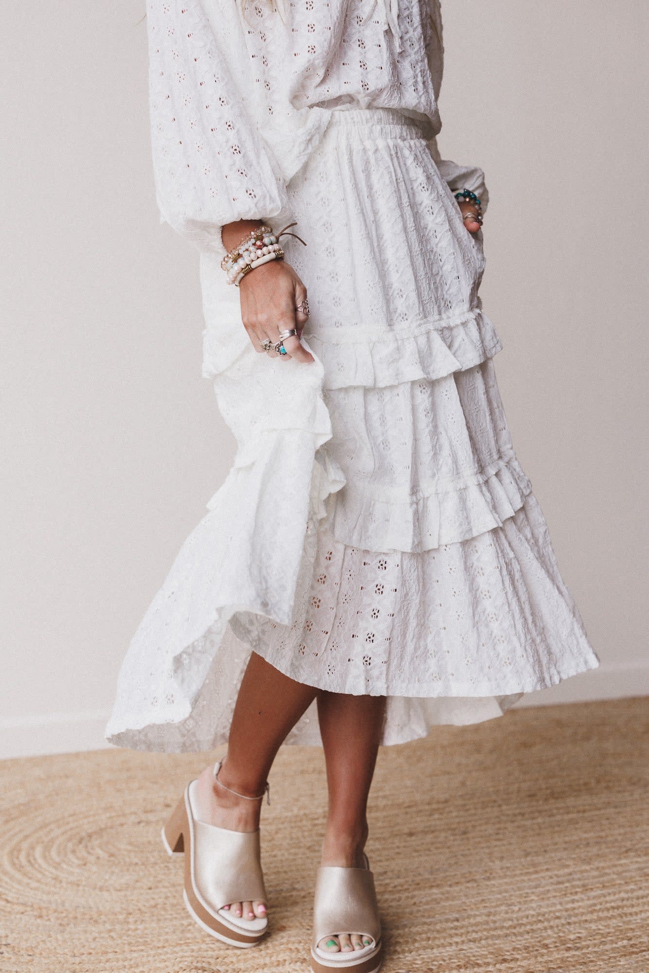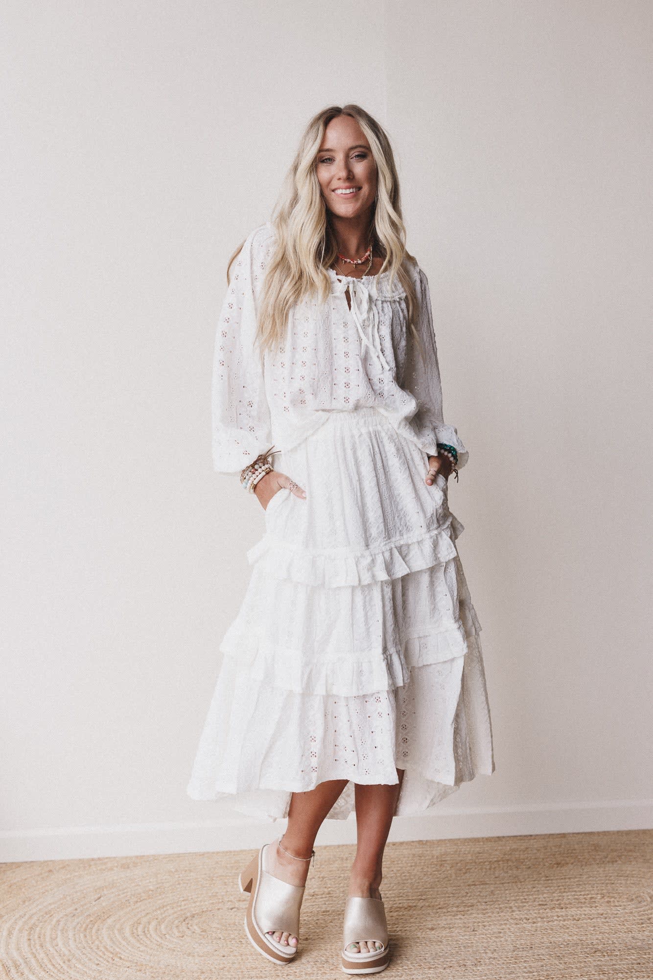 Get in on the cottage core trend with this darling eyelet top and midi skirt set.