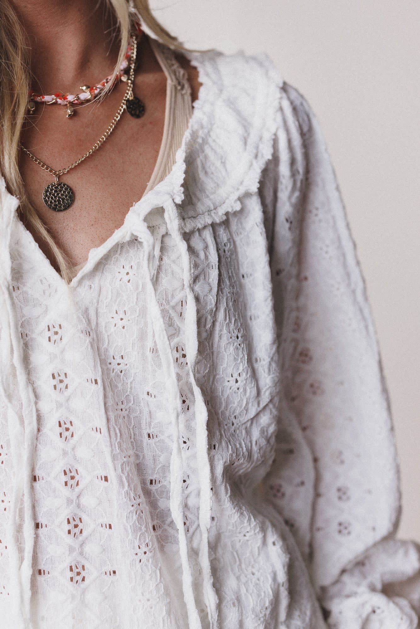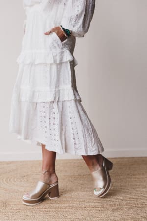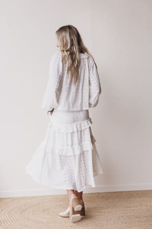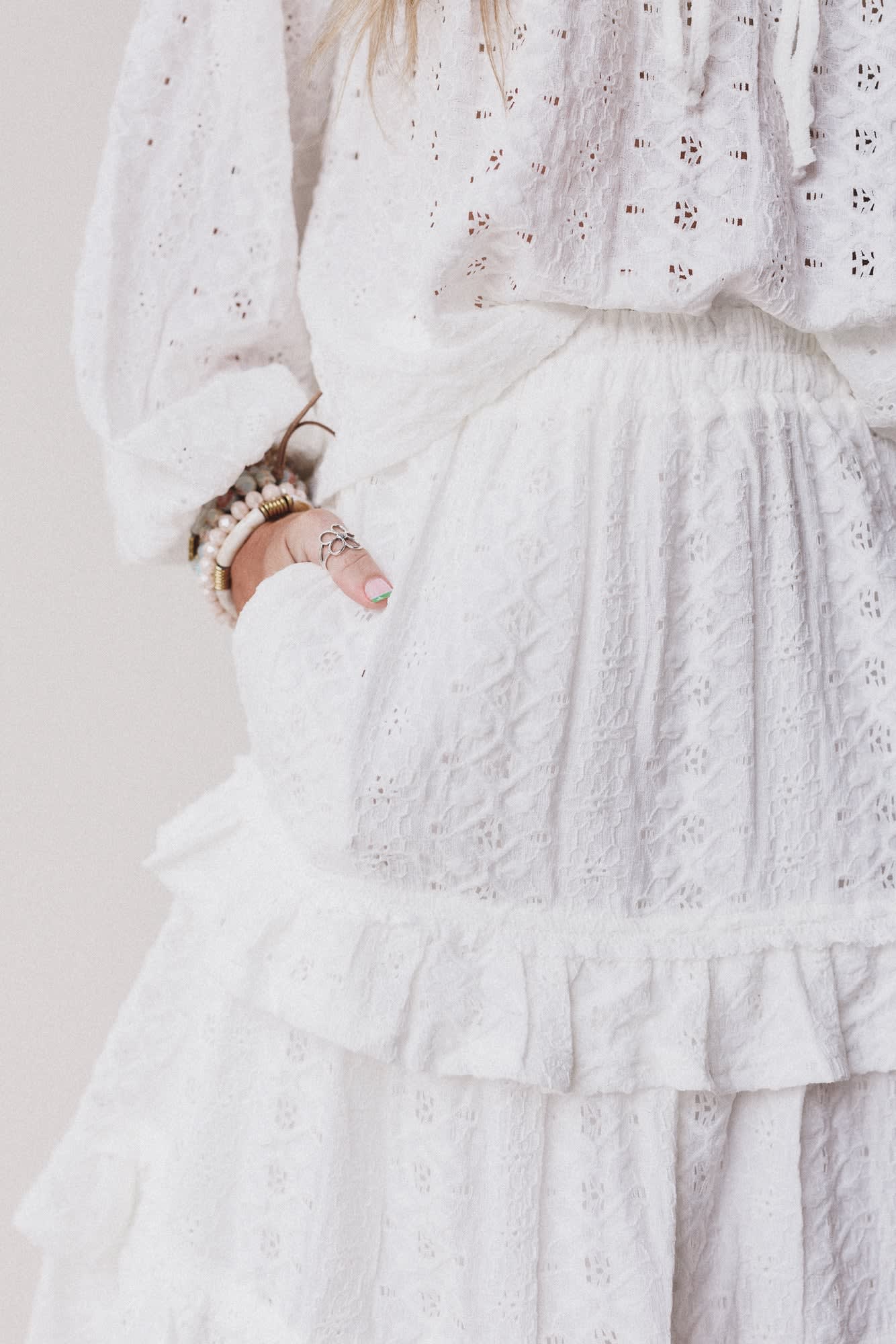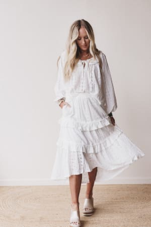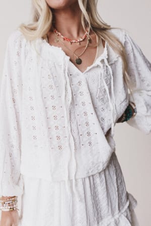 Get in on the cottage core trend with this darling eyelet top and midi skirt set.