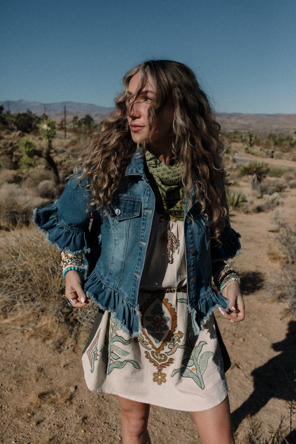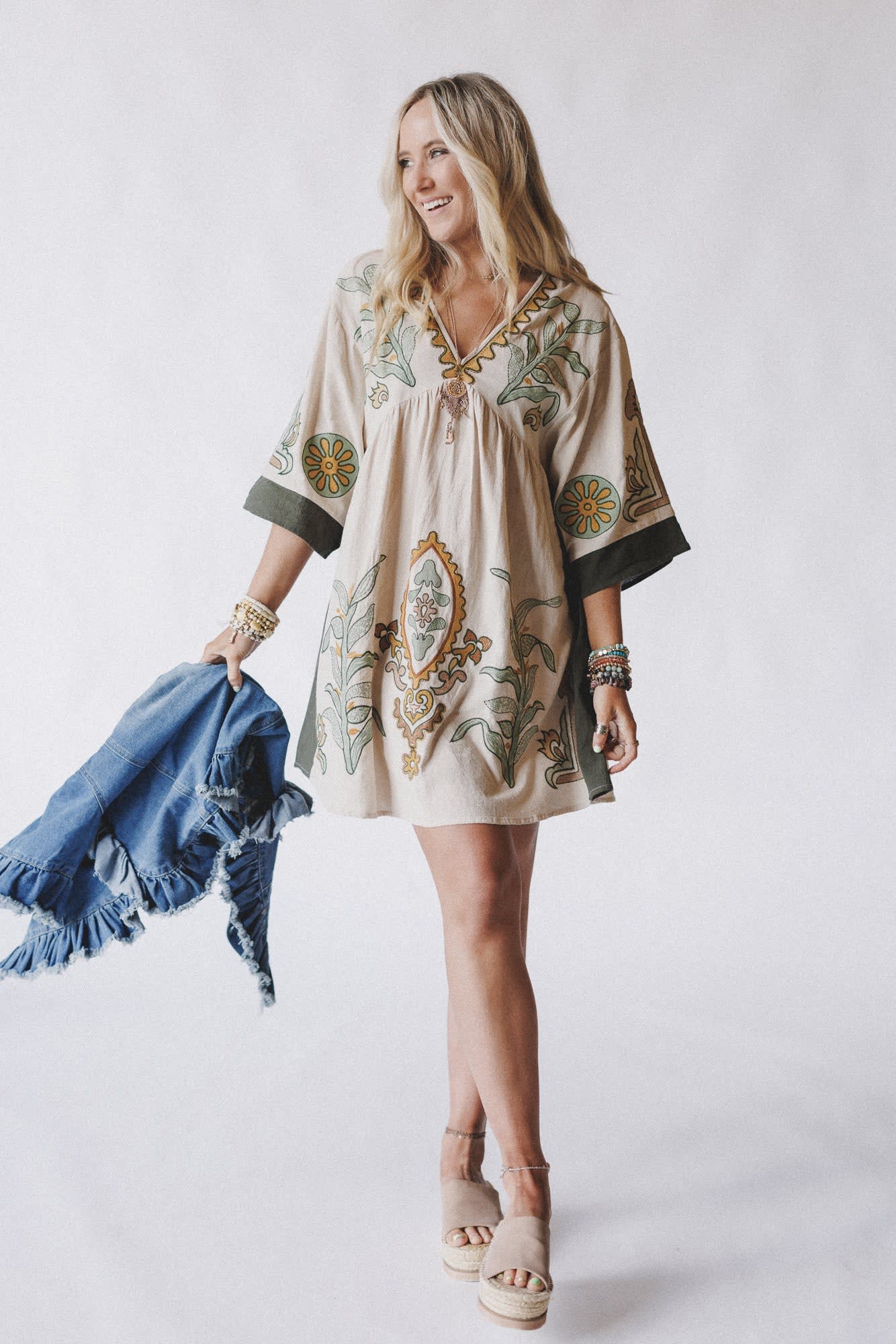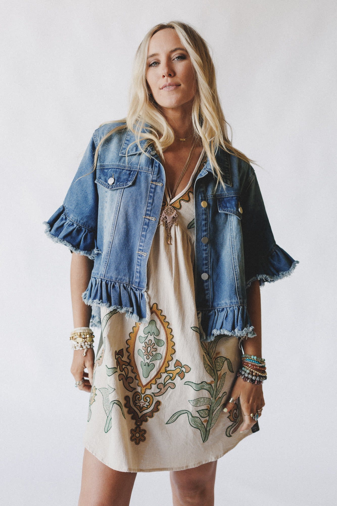 • This boho denim jacket pairs perfectly with maxi dresses and sandals.