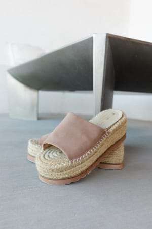 • Microfiber suede leather, 30% genuine leather, 70% natural raffia, synthetic lining and sole, braided natural raffia platform