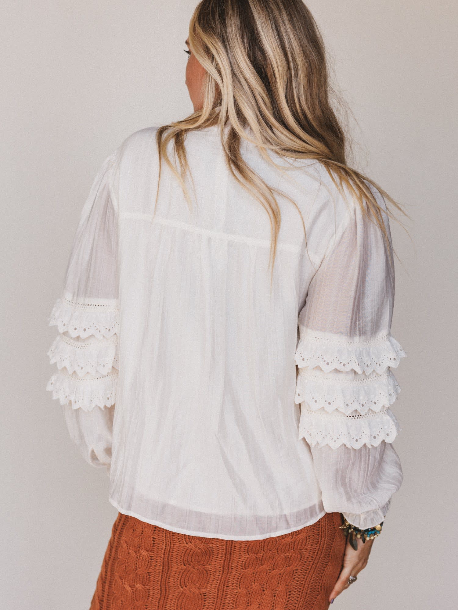 - Romantic layered eyelet lace on sleeves for a vintage-inspired touch