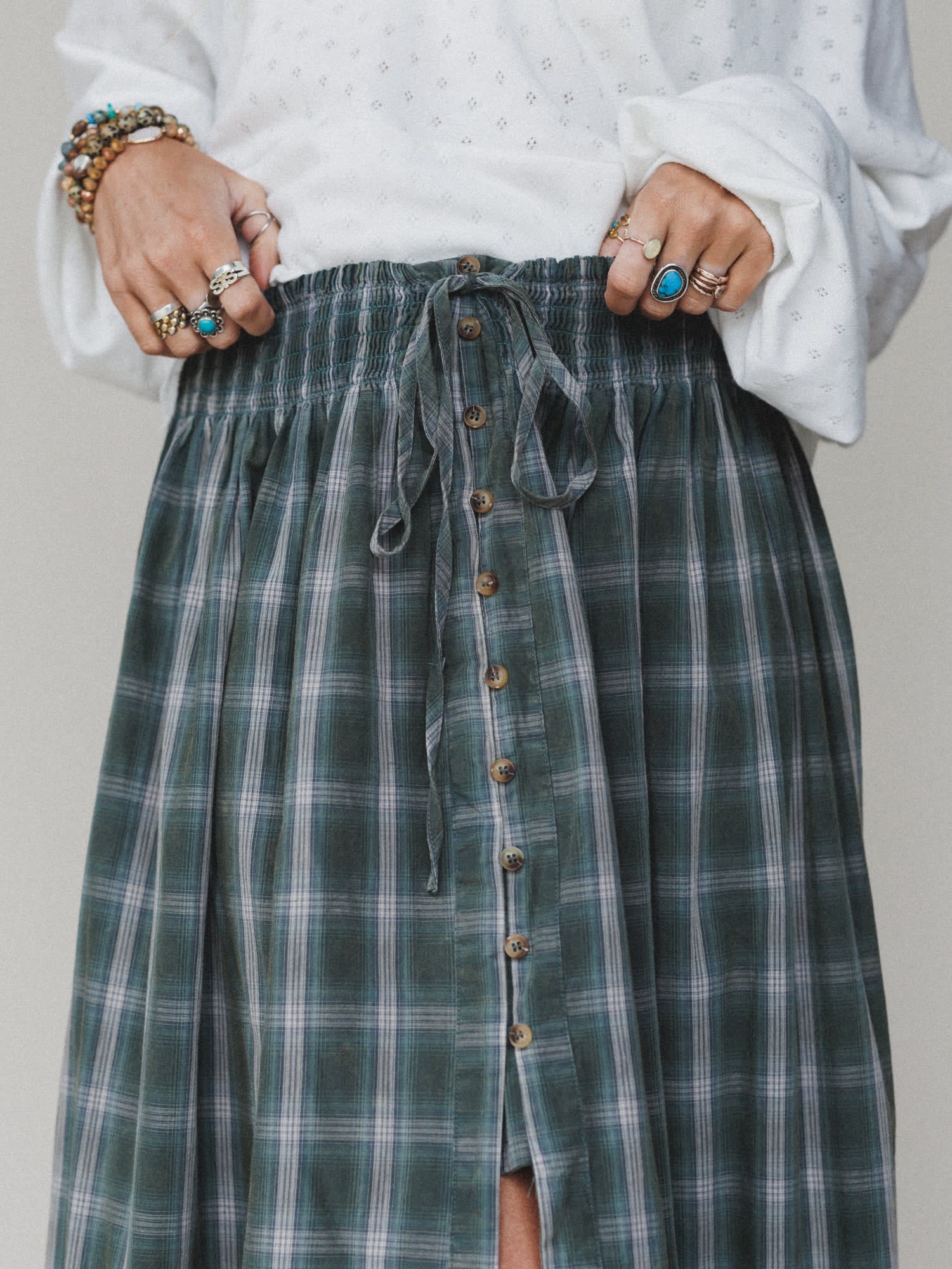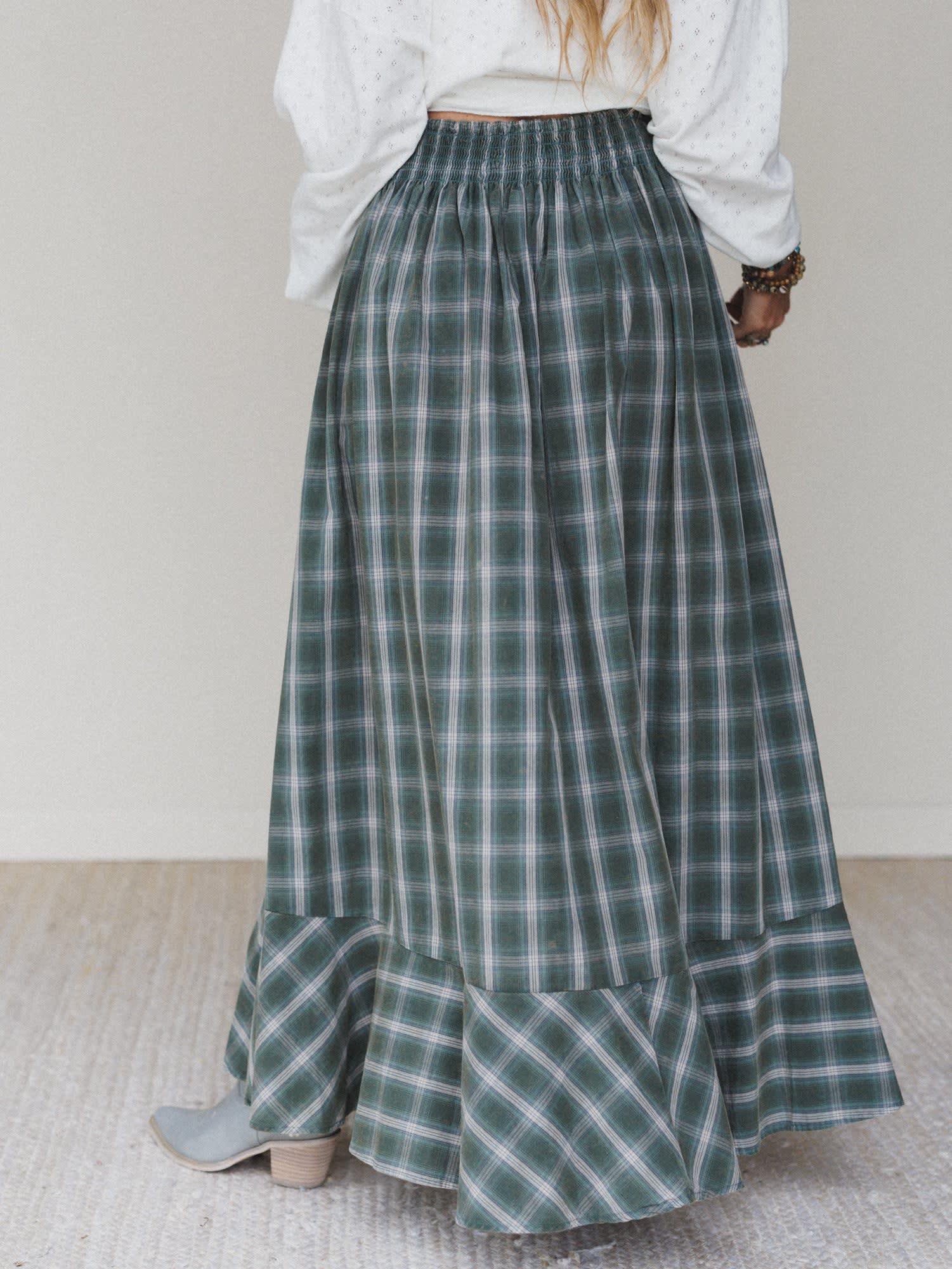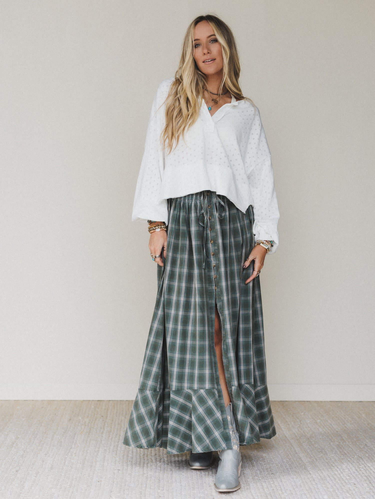 - Bonfire Bloom Plaid Skirt: A sweeping maxi skirt in a forest-green plaid, complete with a button front, drawstring waist, and ruffled hem that flows with every step.