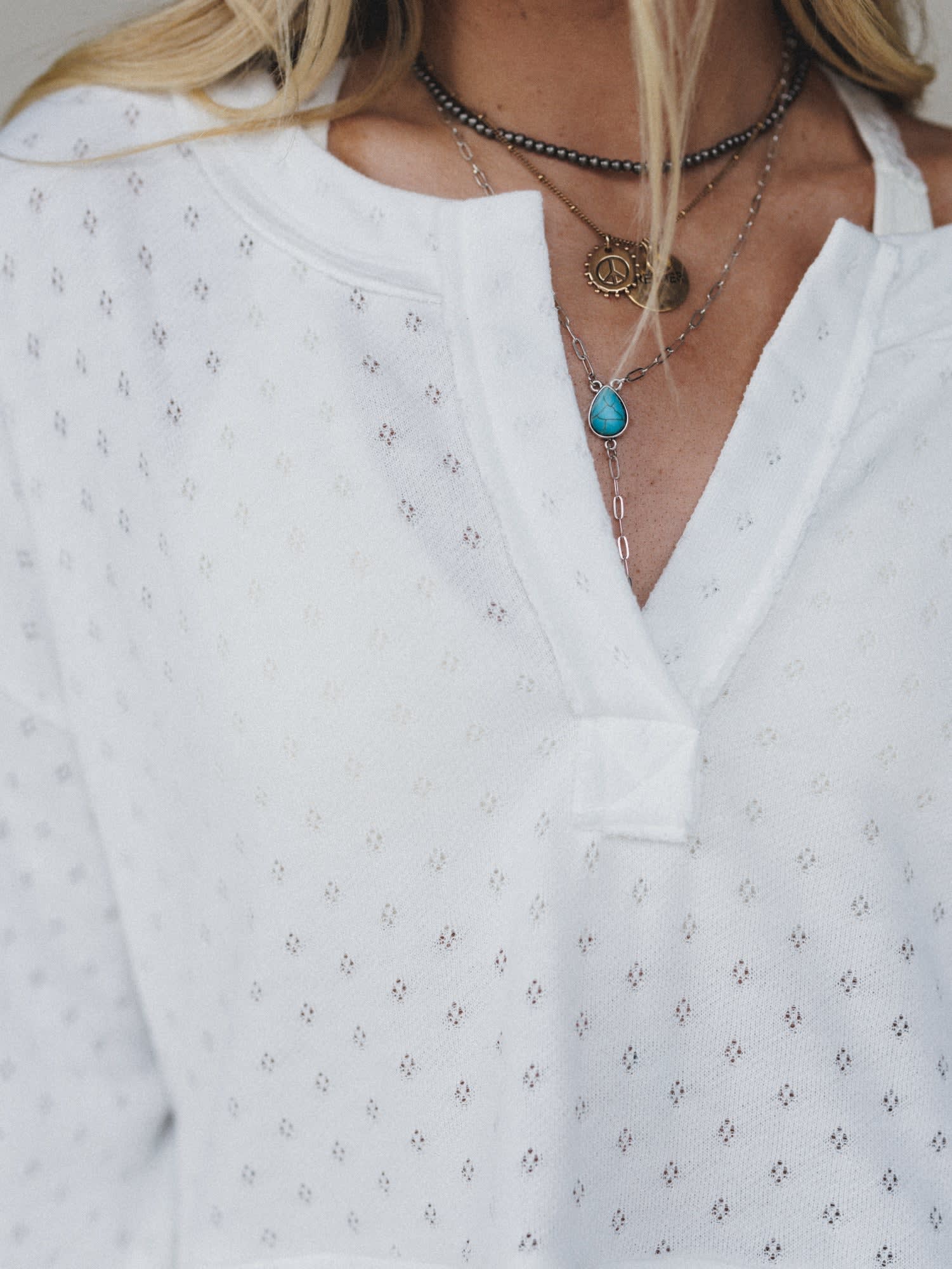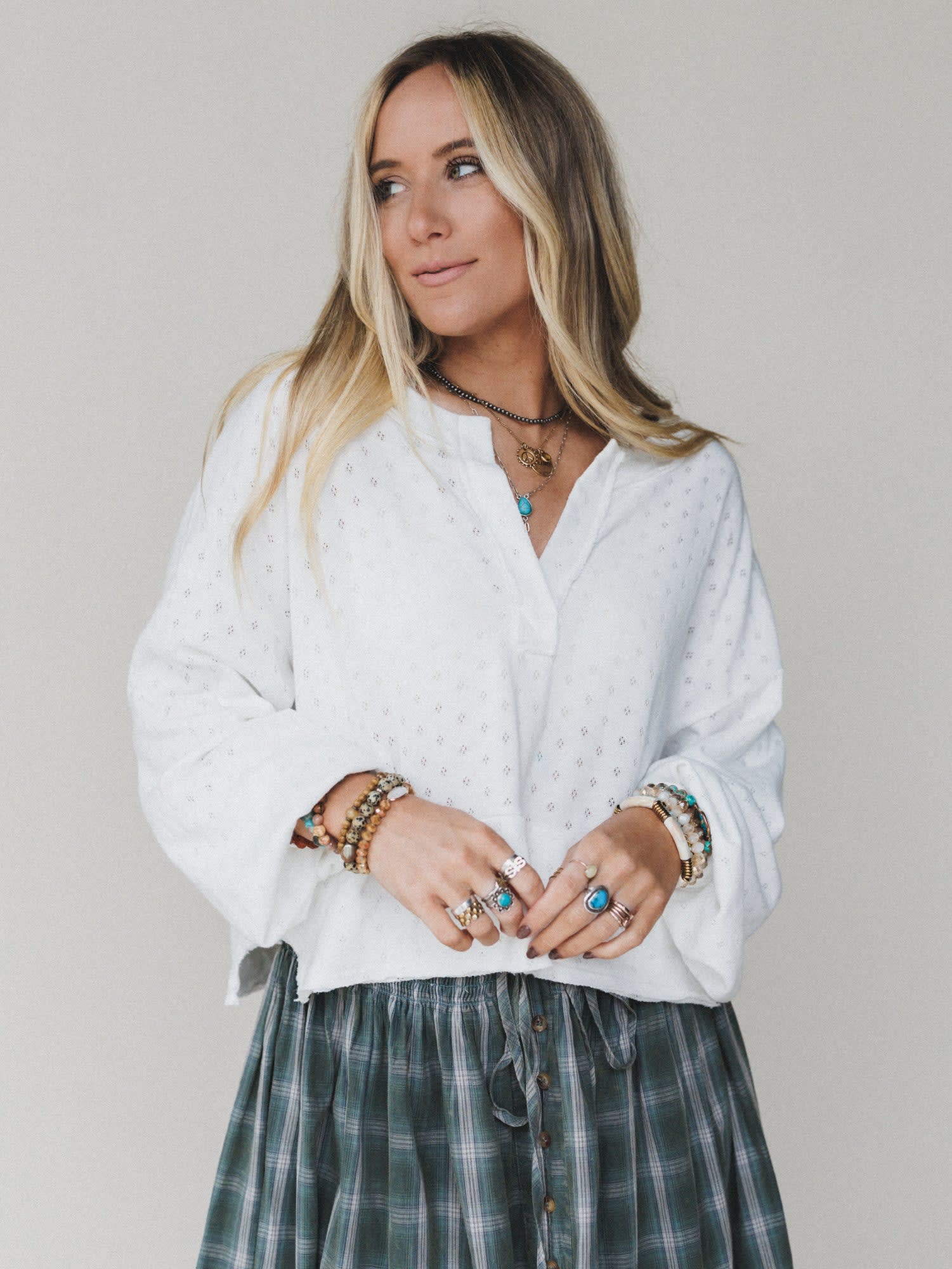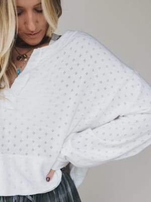 - Luna Breeze Top: A lightweight thermal pullover with eyelet detailing and a relaxed fit, perfect for layering over bralettes or tucking into high-waisted bottoms.