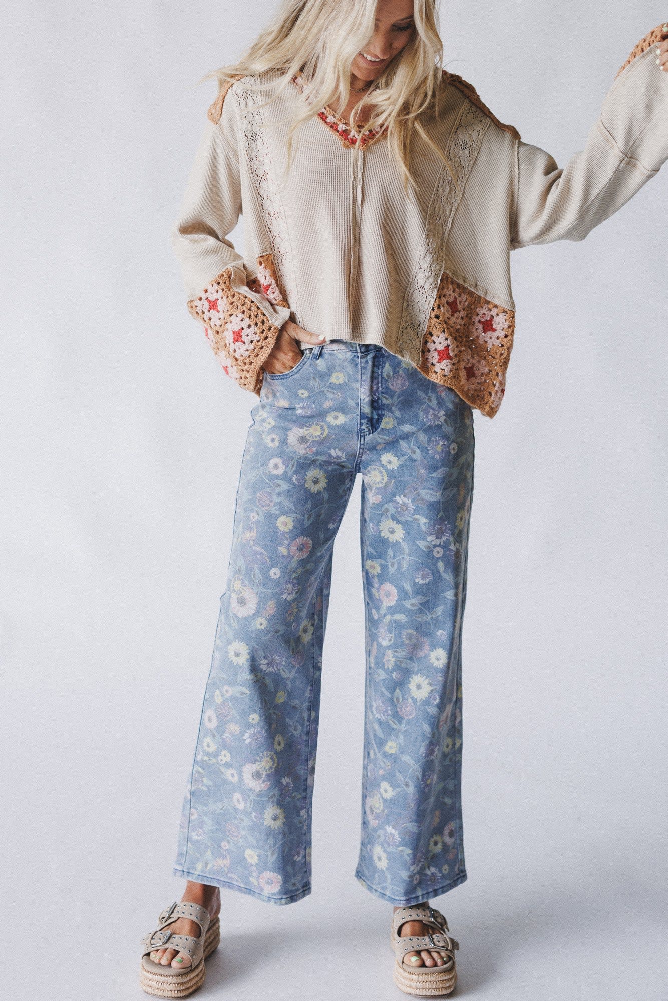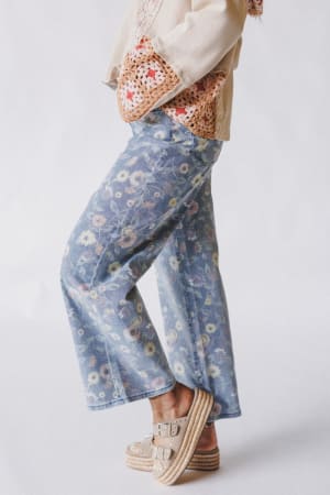 These colorful boho jeans feature a festive floral print perfect for spring.