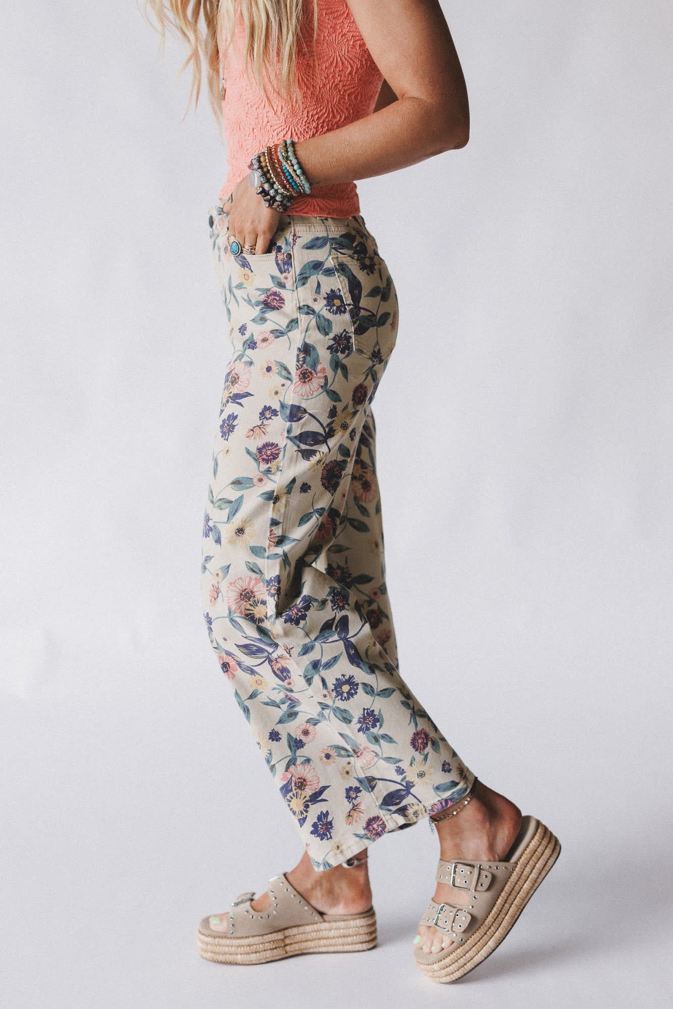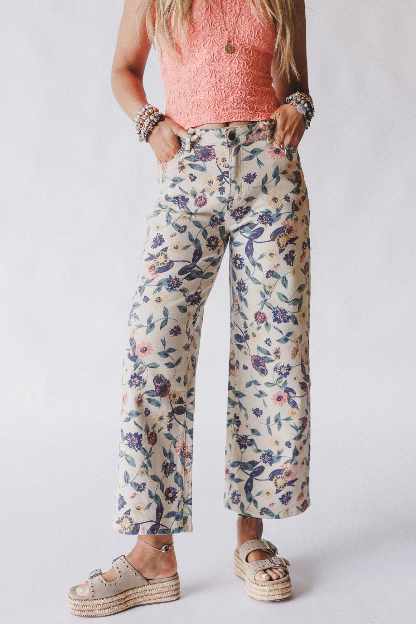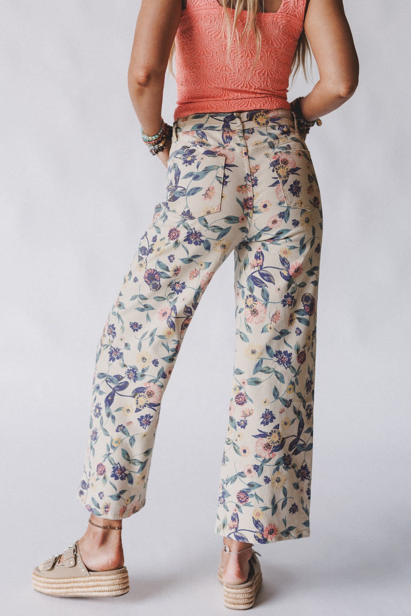 These colorful boho jeans feature a festive floral print perfect for spring.