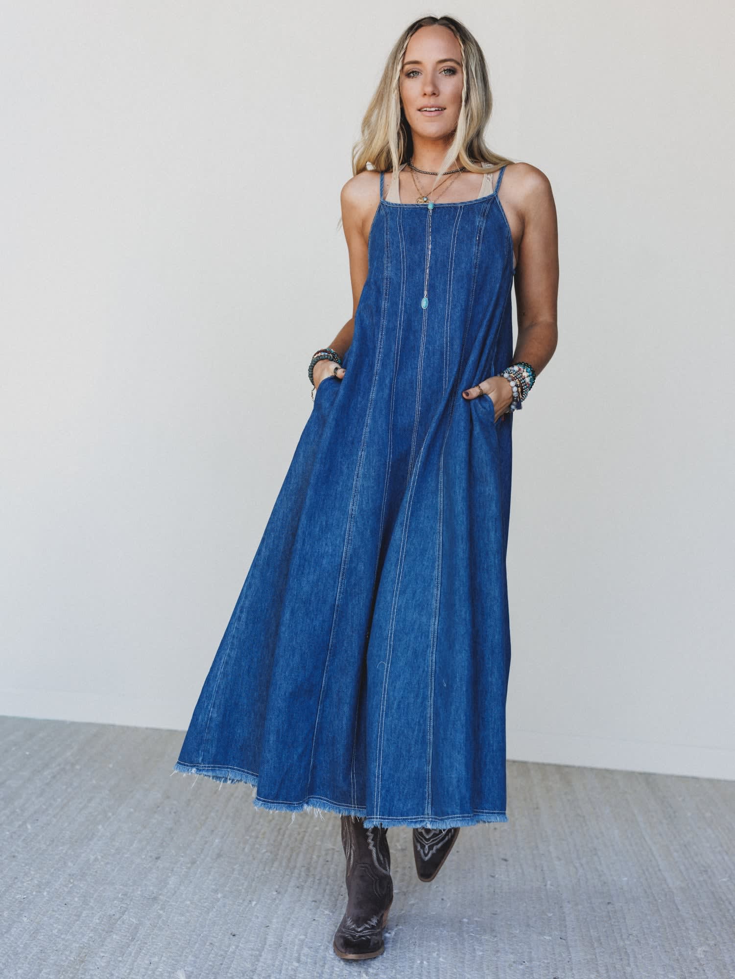 Easygoing elegance meets western whimsy in the Bowtied Belle Maxi Dress. With its swingy denim silhouette, adjustable straps, and a show-stopping back bow, this dress is made for twirling under open skies. Layer it with a bralette for boho charm or dress it up with boots and bangles for your next outdoor concert or market stroll.
