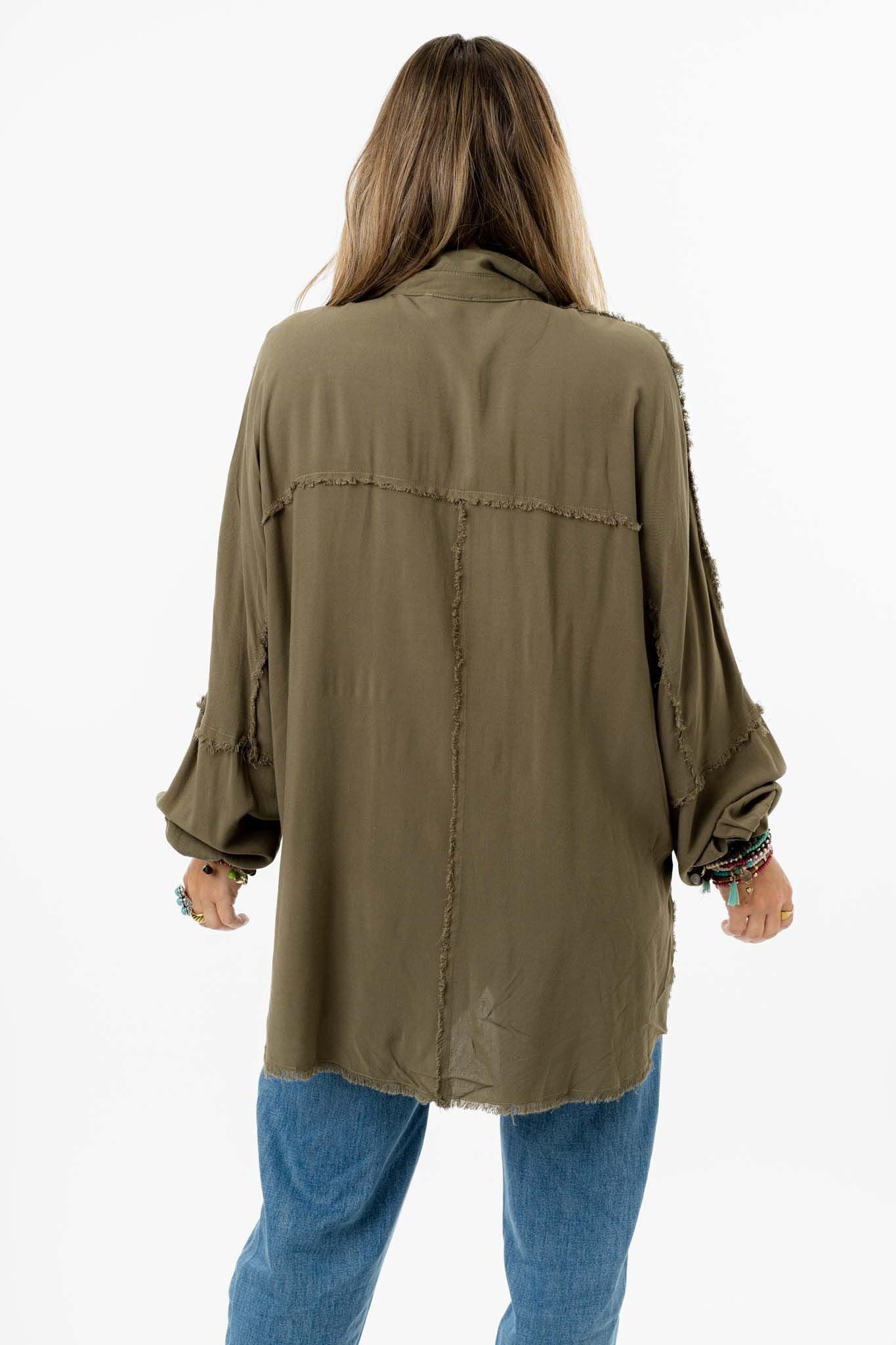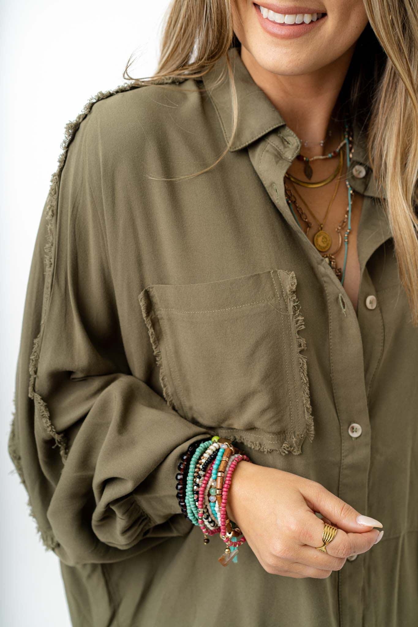 Boho has never looked so good than in the Bradley Button Down Top. Featured in a lightweight cotton fabric with a classic, slouchy button-down style, raw edge details throughout for added boho style, and long sleeves with gathered cuffs - it's perfect the be dressed up or down.