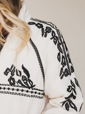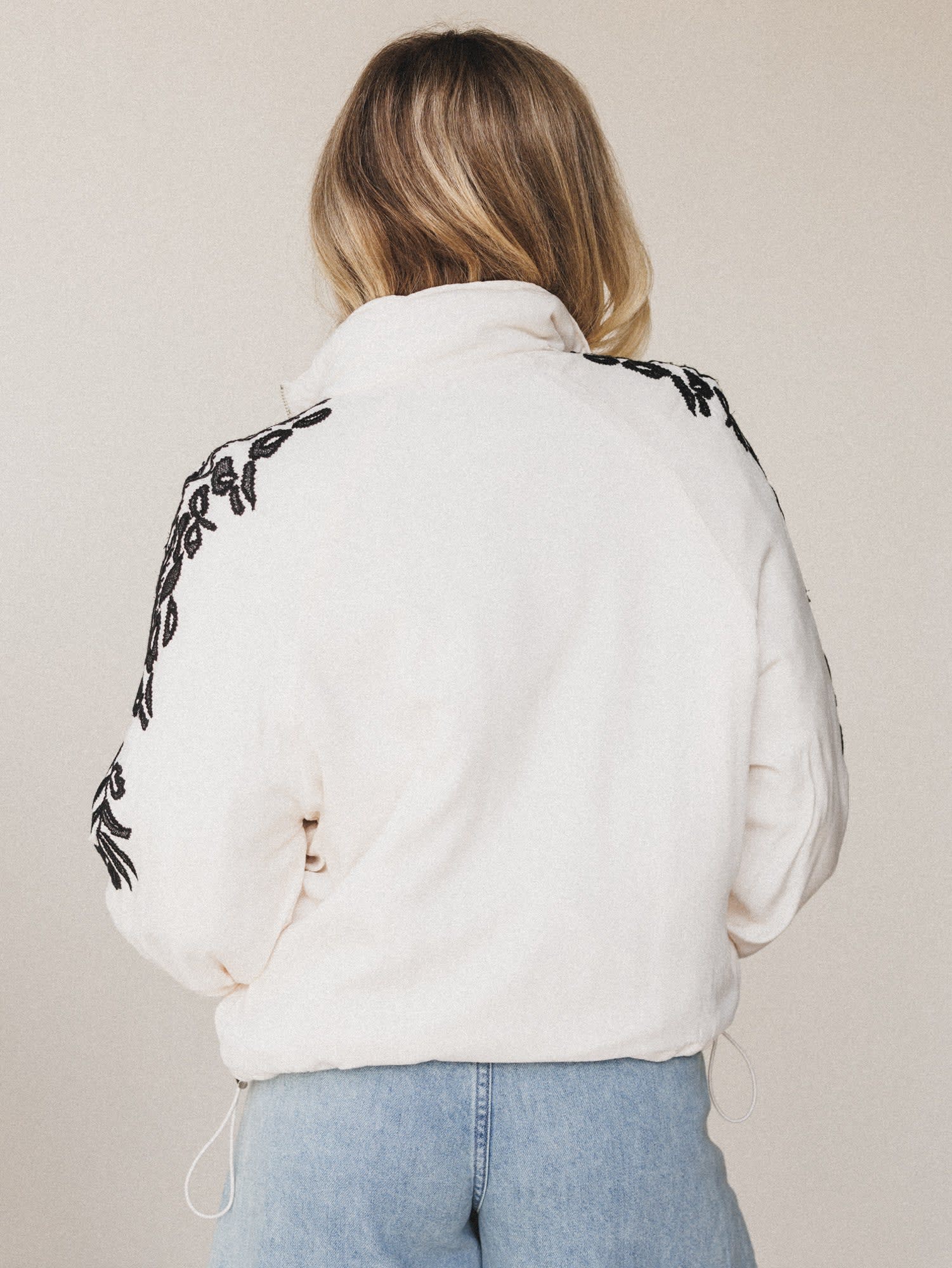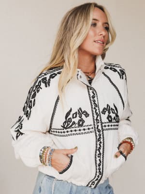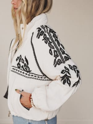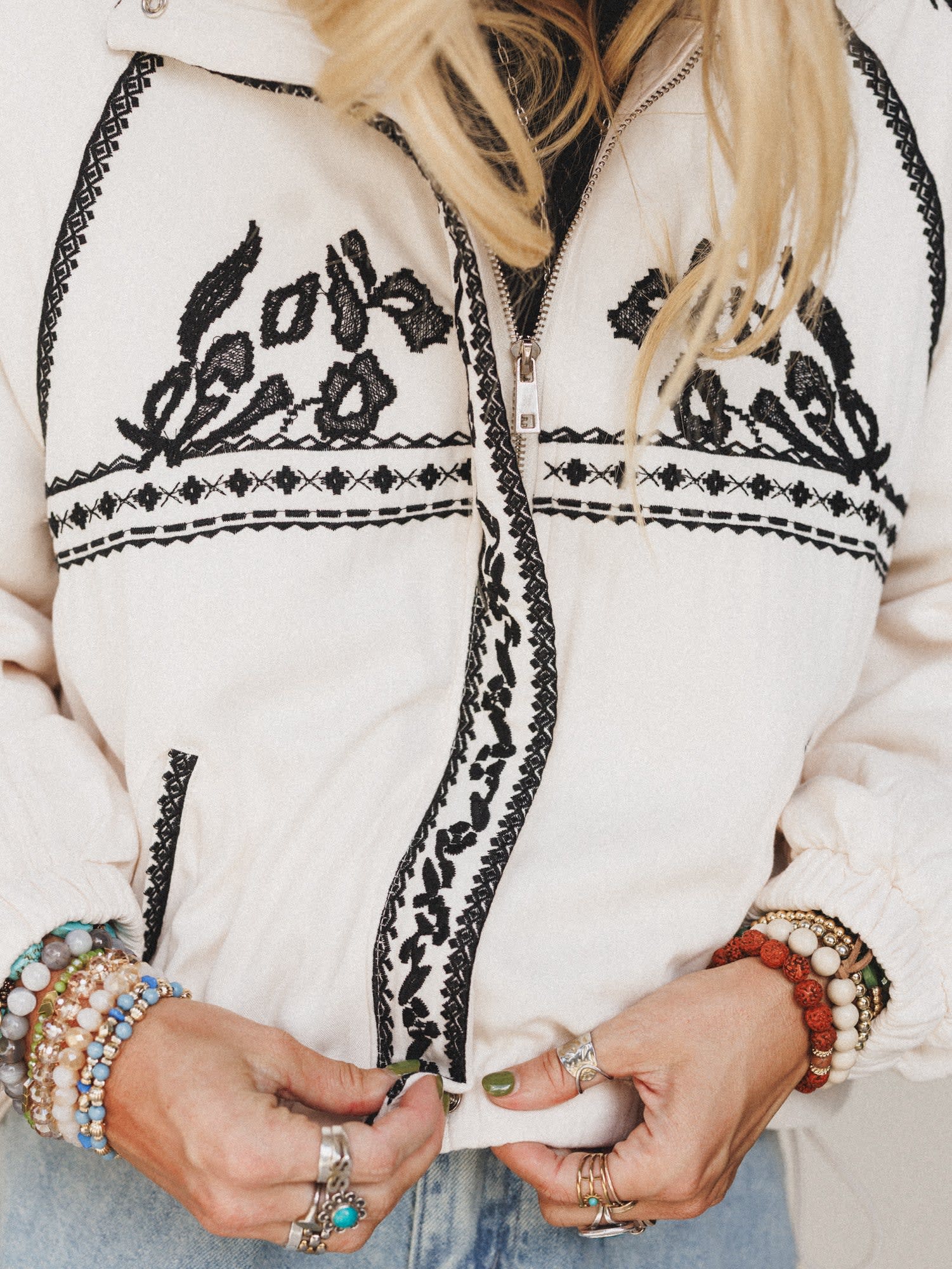 A modern twist on timeless embroidery, the Brayden Jacket brings cozy comfort with an edge. Crafted in a creamy hue with intricate black threadwork, this jacket channels artisan detail in a relaxed silhouette.