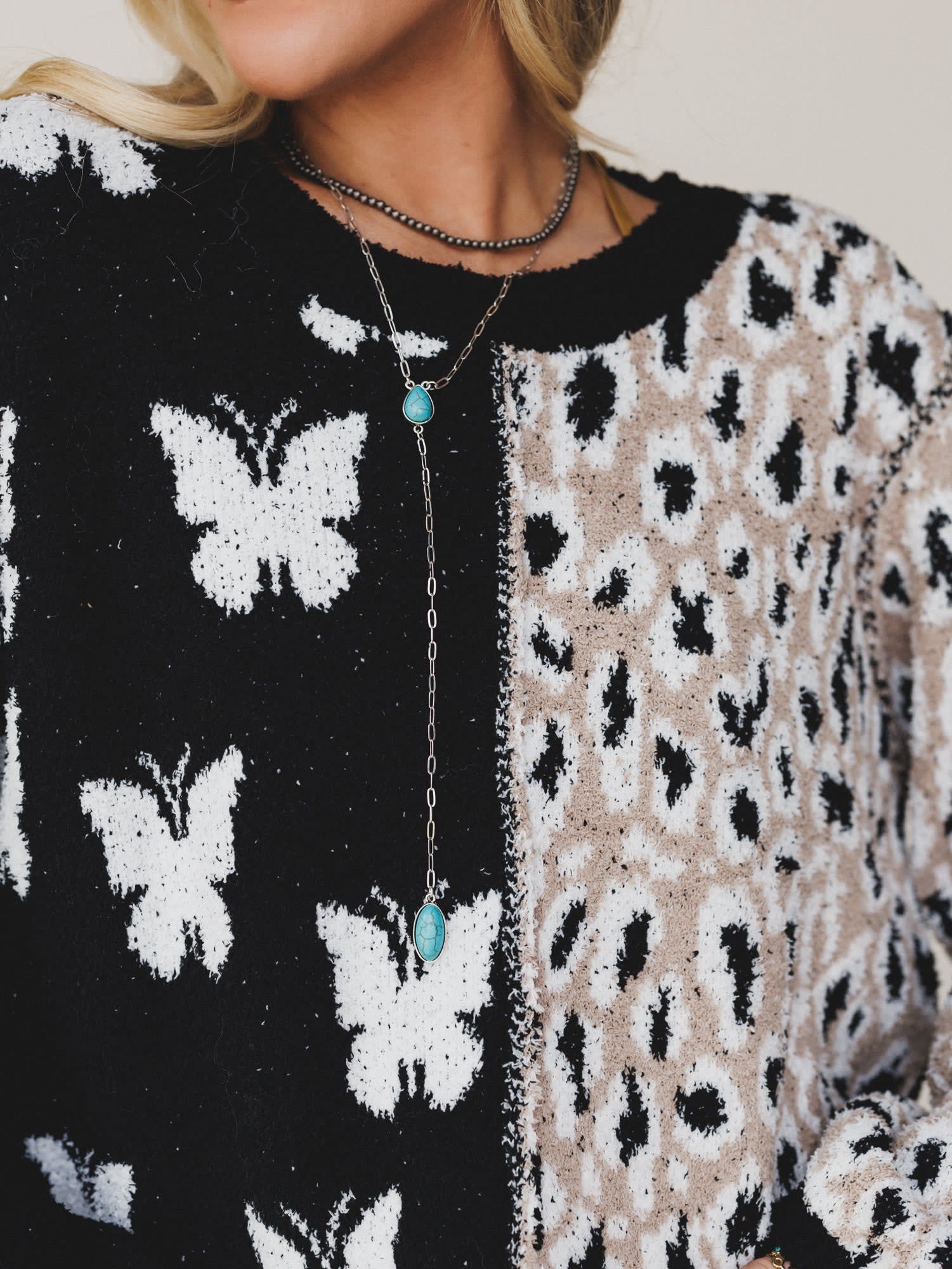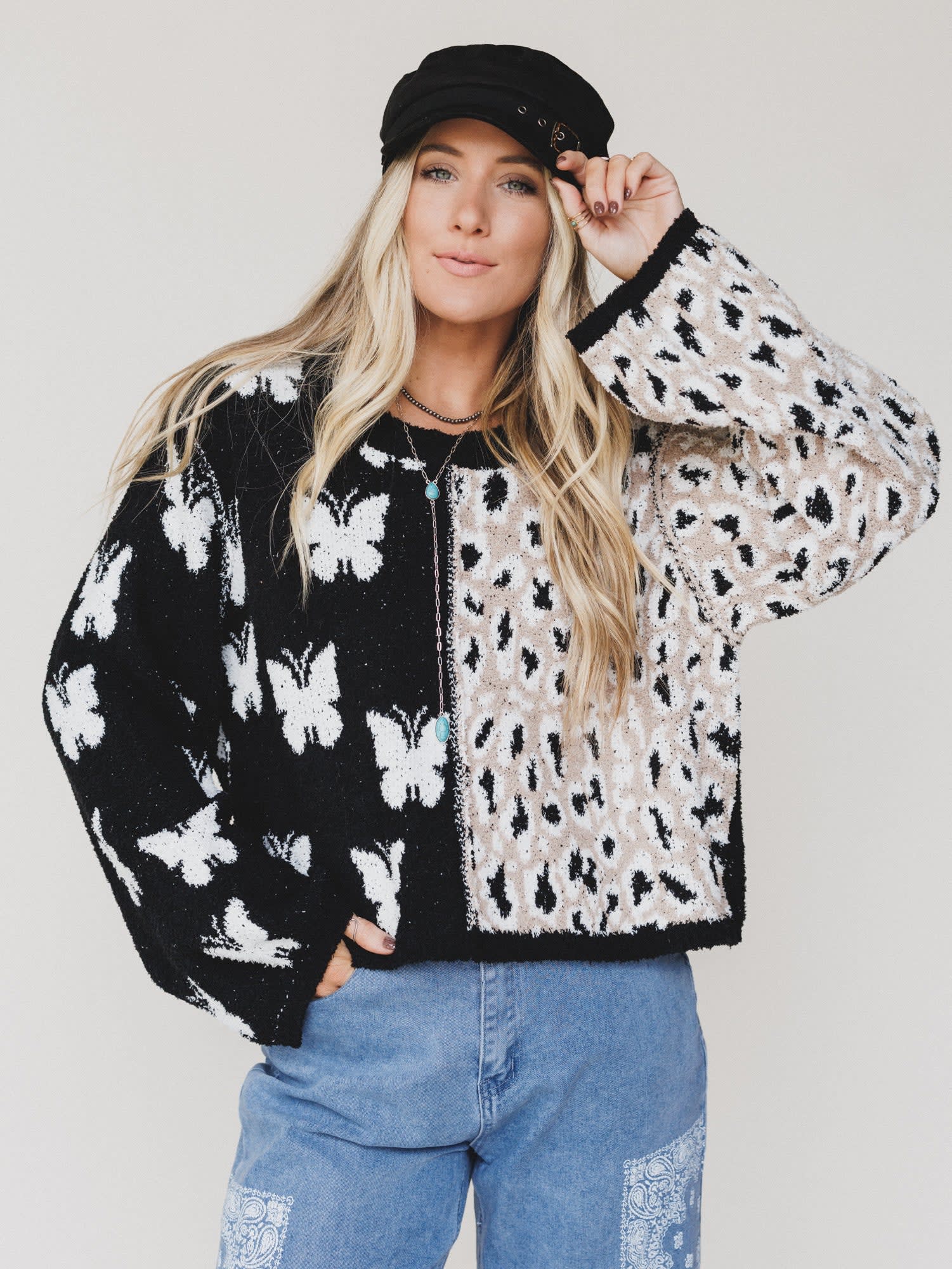 Bold, playful, and totally one-of-a-kind—the Bri Sweater brings a little wild and a little whimsy to your cool-weather closet. With contrasting butterfly and leopard prints, this cozy piece is all about expressing your free spirit.