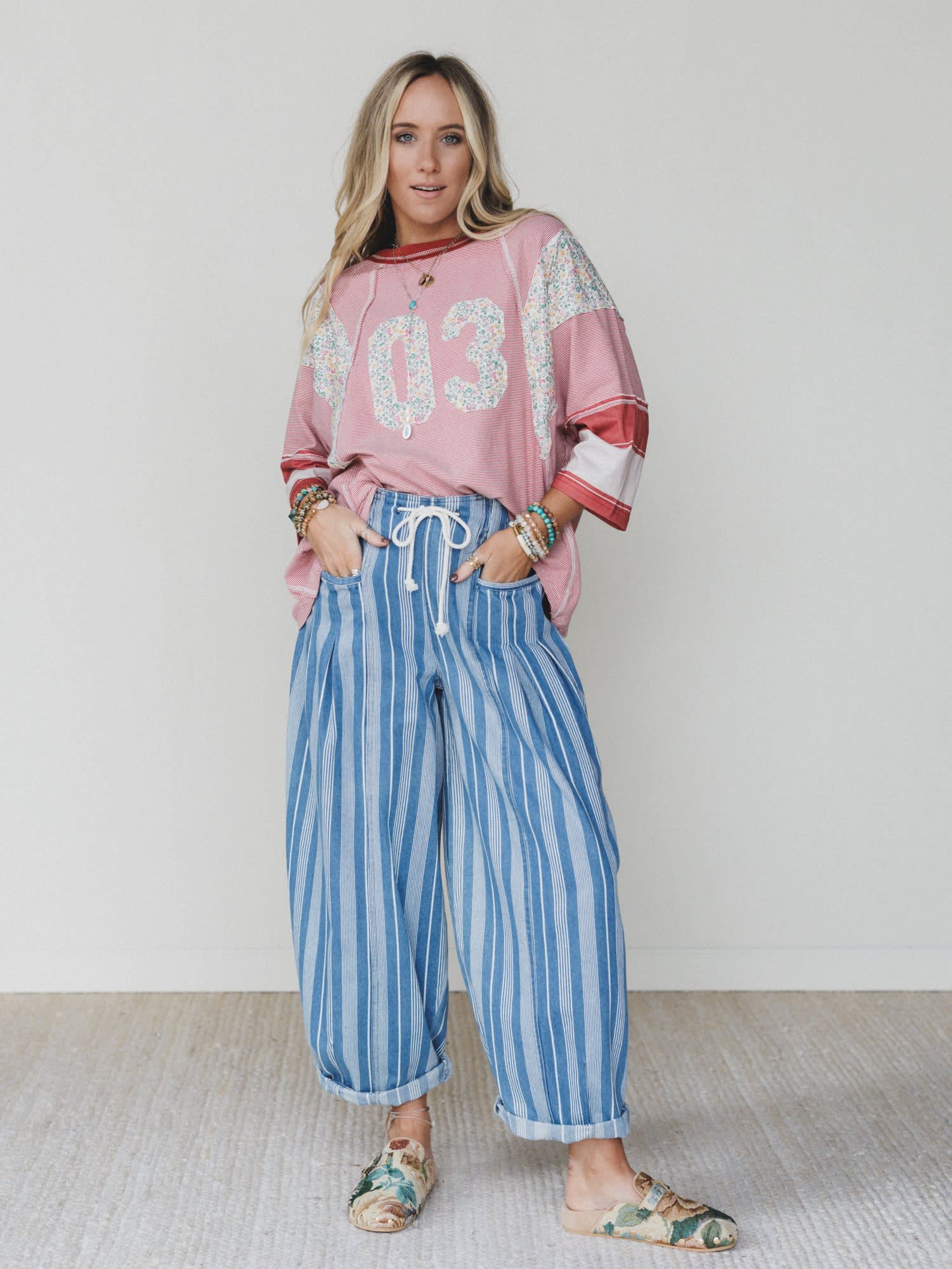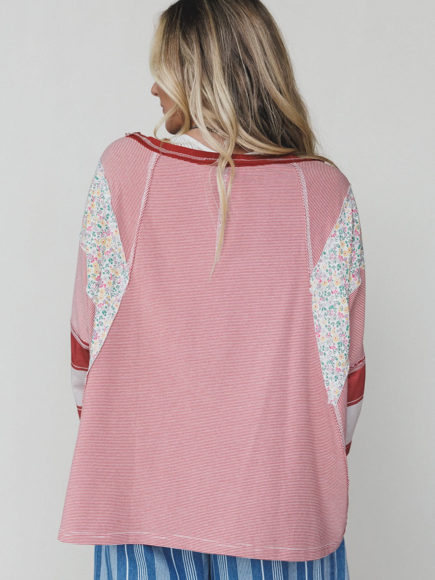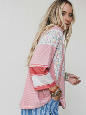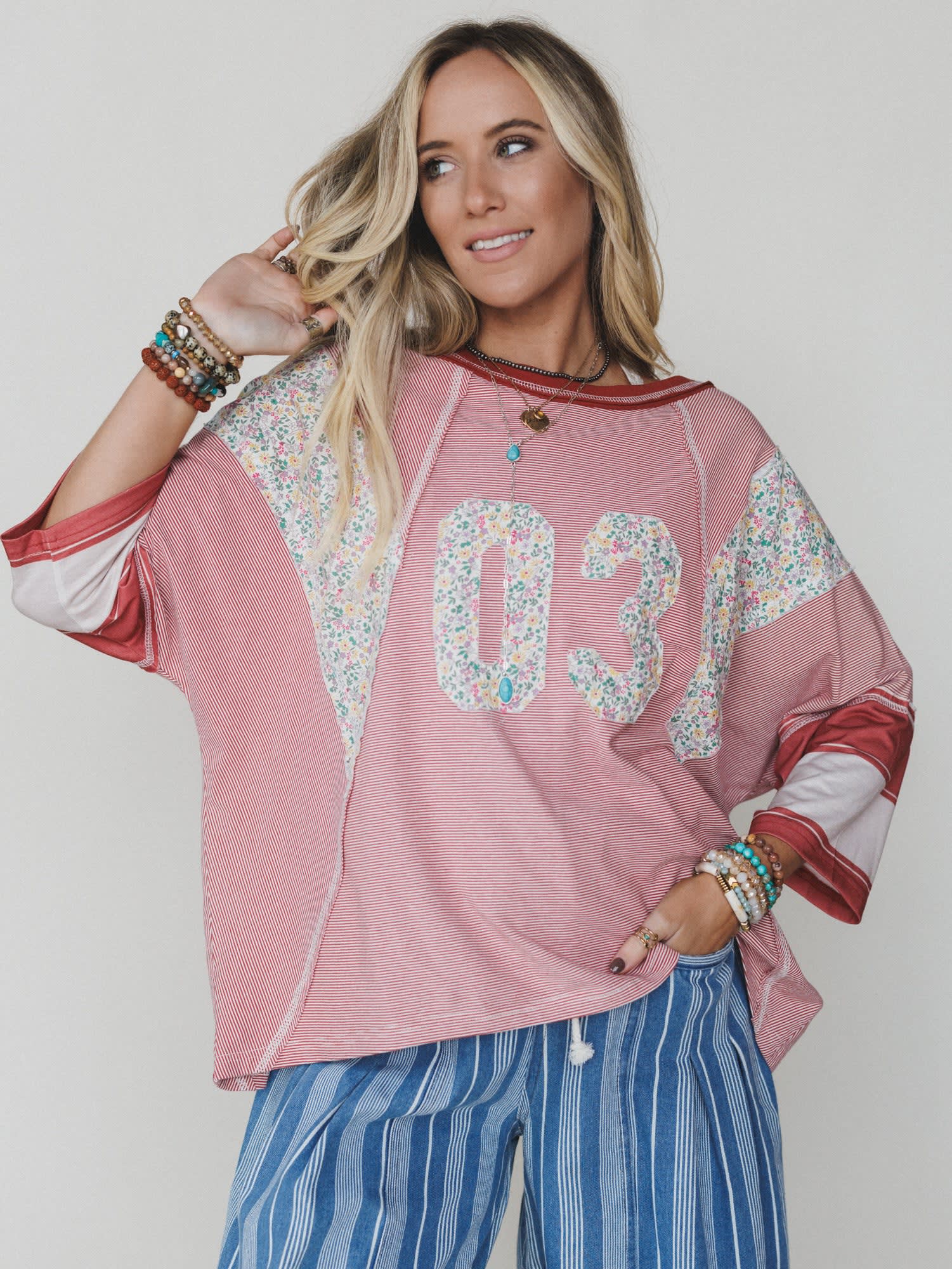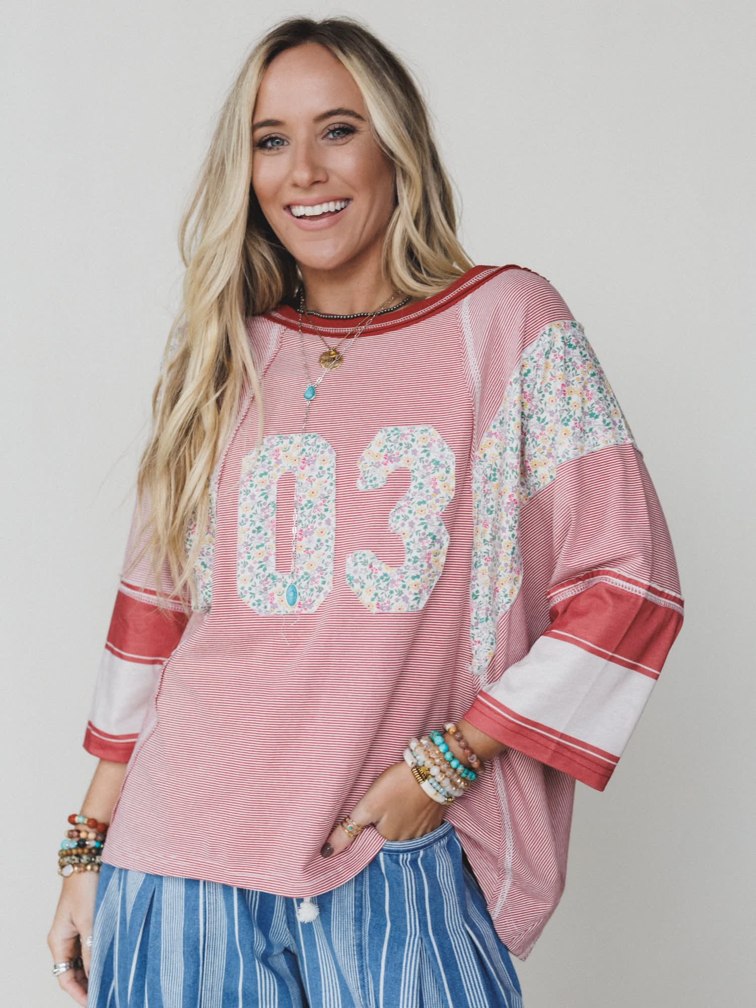Our best-selling Britt just got a bold new twist. The Britt Patchwork Top returns in a fresh update with sporty vintage flair, featuring a floral varsity-style number front and all the patchwork charm you know and love.