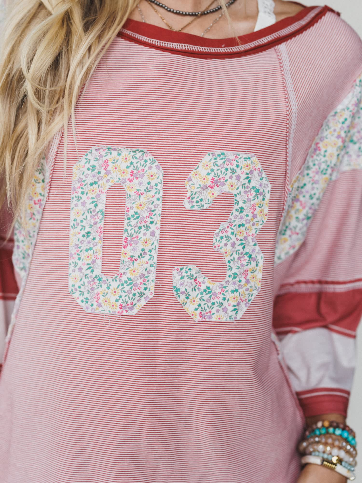 - Eye-catching “03” appliqué in ditsy floral print brings playful retro vibes