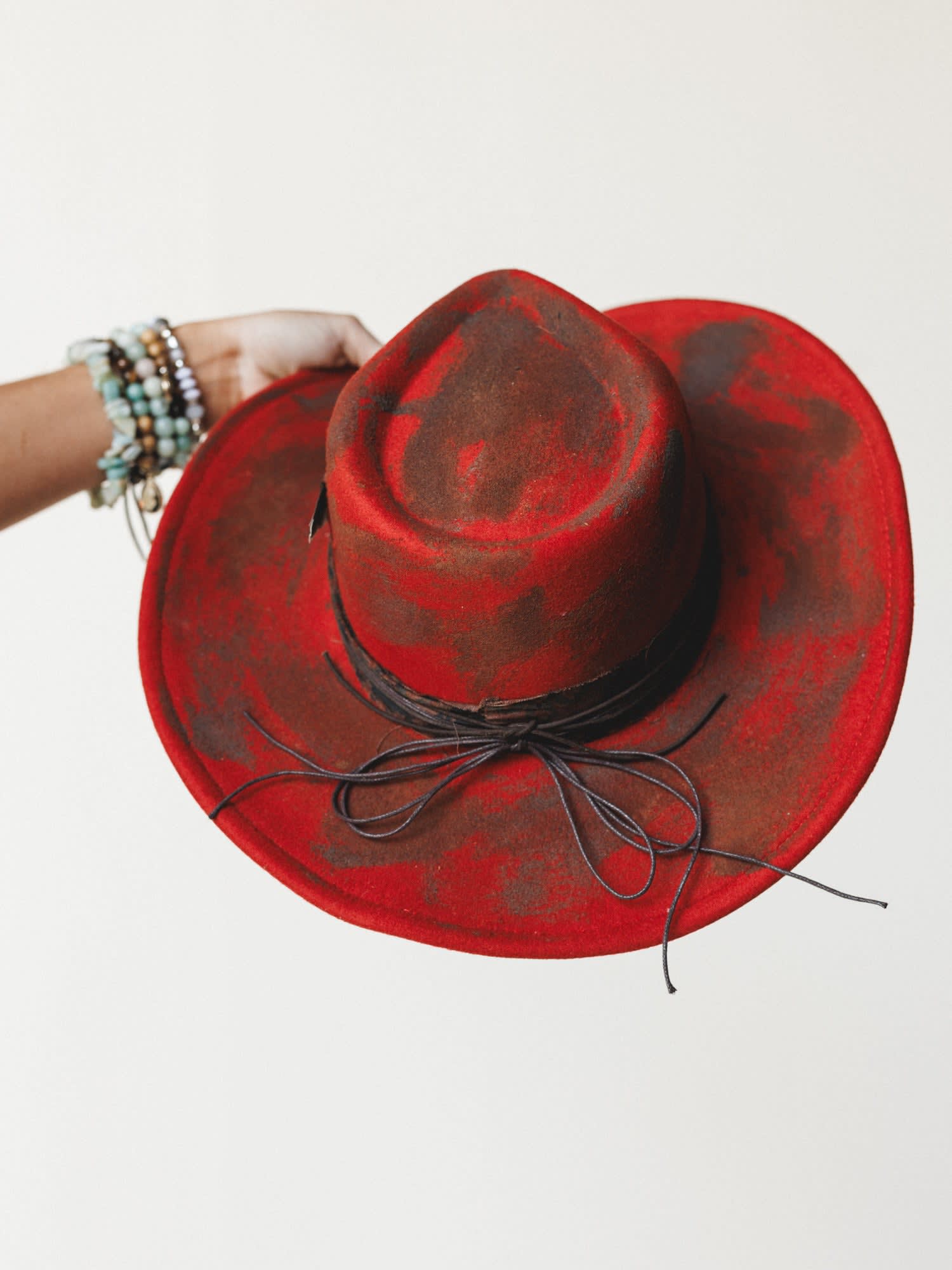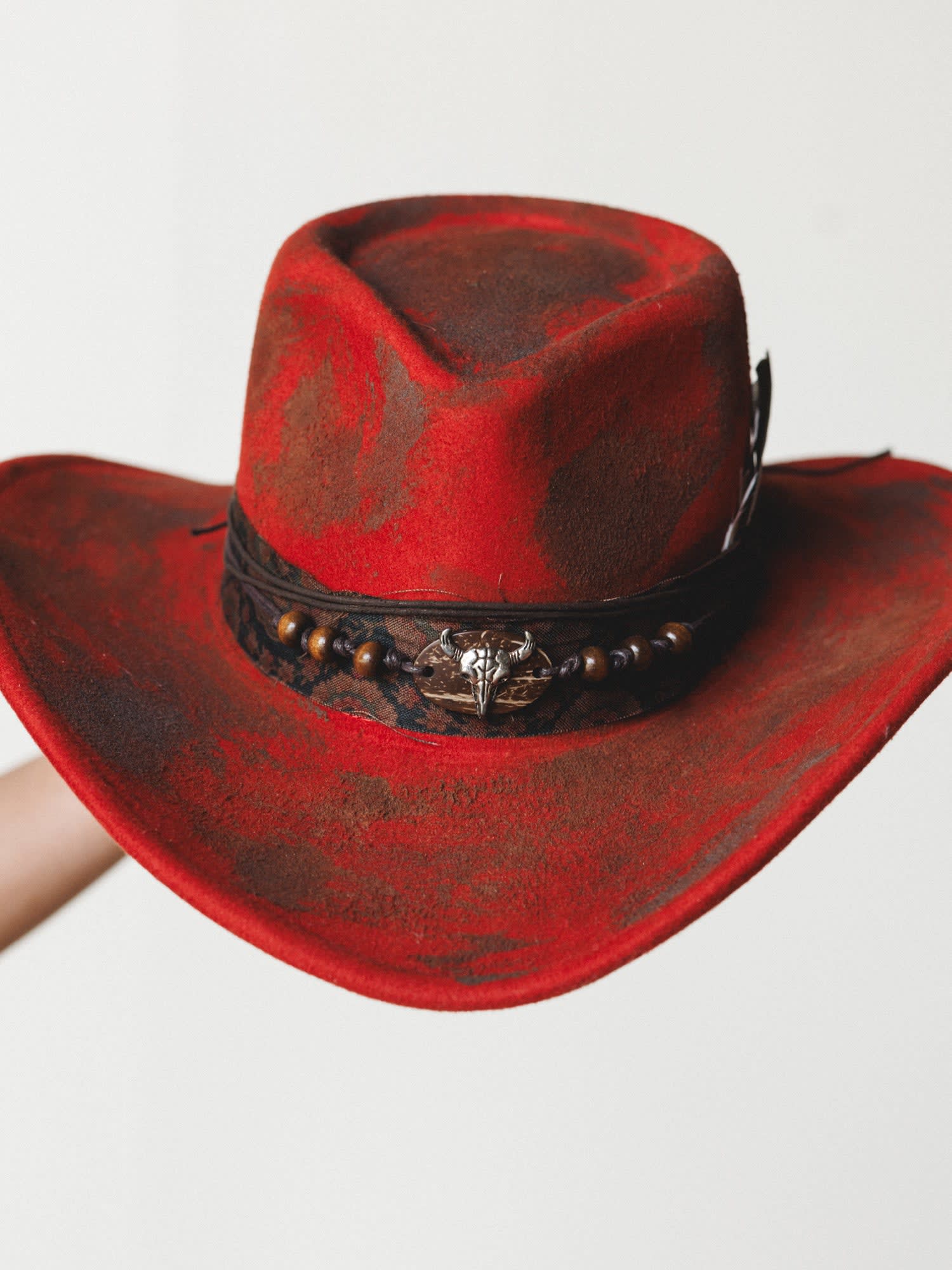 Whether you're headed to a country concert or planning the perfect boho outfits for a weekend getaway, this statement cowboy hat brings authentic Western flair to your free-spirited style. The distressed finish and embellished leather hatband create an effortlessly lived-in look that pairs beautifully with your favorite boho clothing.