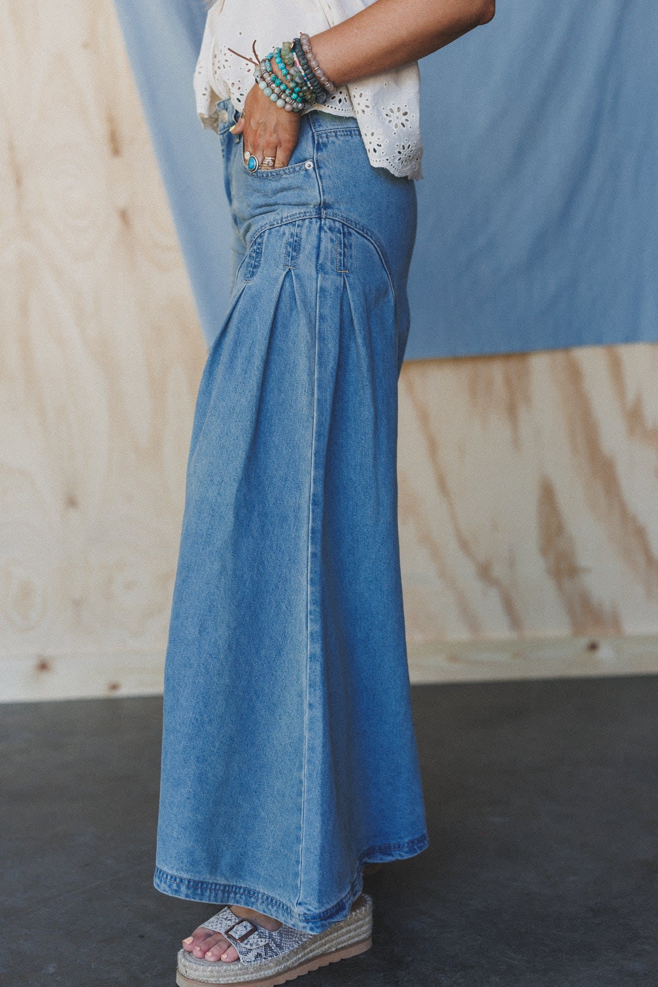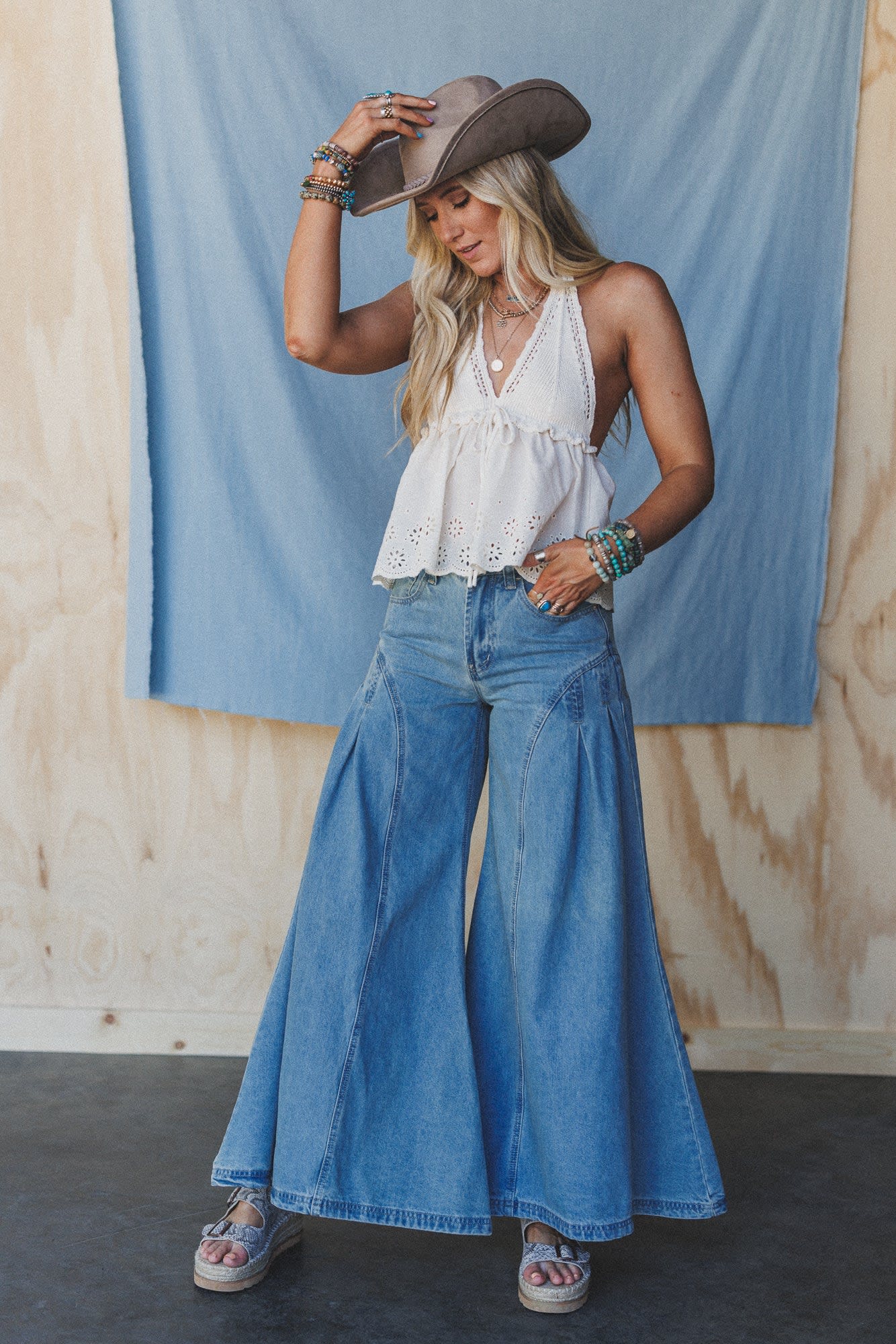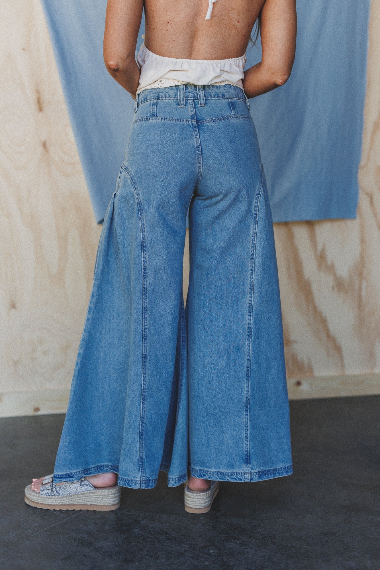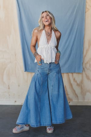 These dramatic wide leg jeans look amazing with a button-down skirt and booties.