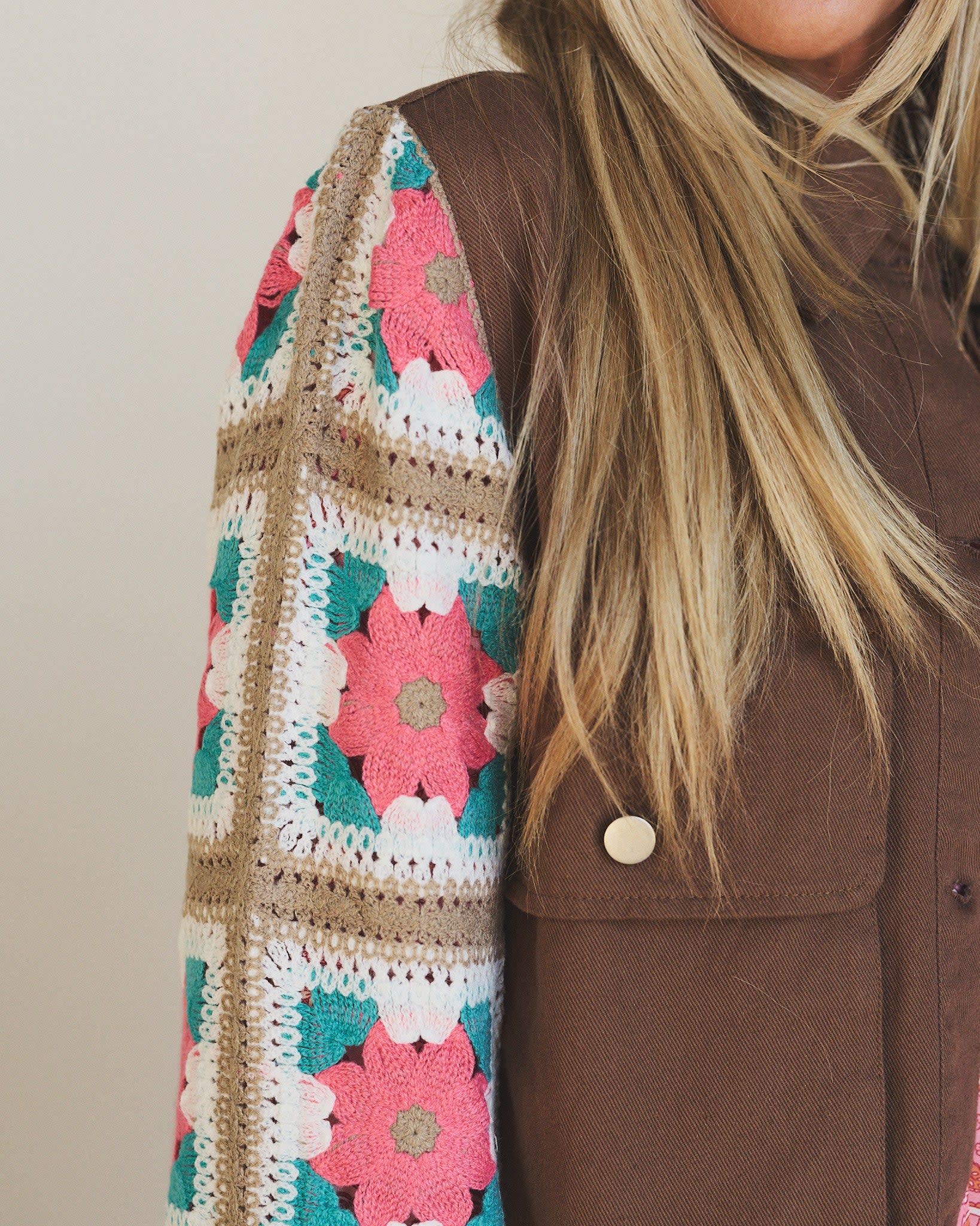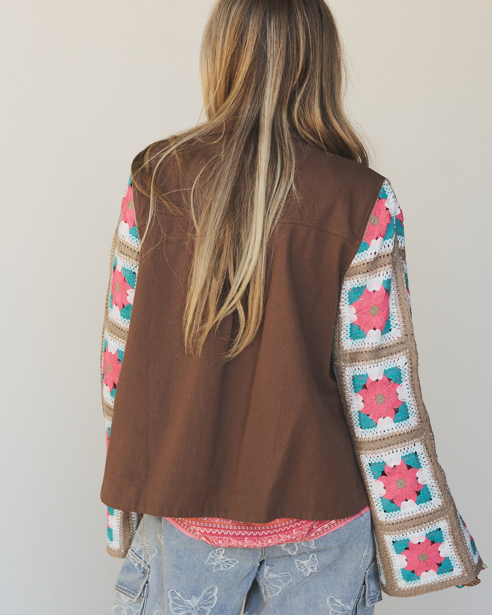 • Willow Bloom Crochet Jacket: A fan favorite with colorful granny square sleeves and a soft brown body for contrast