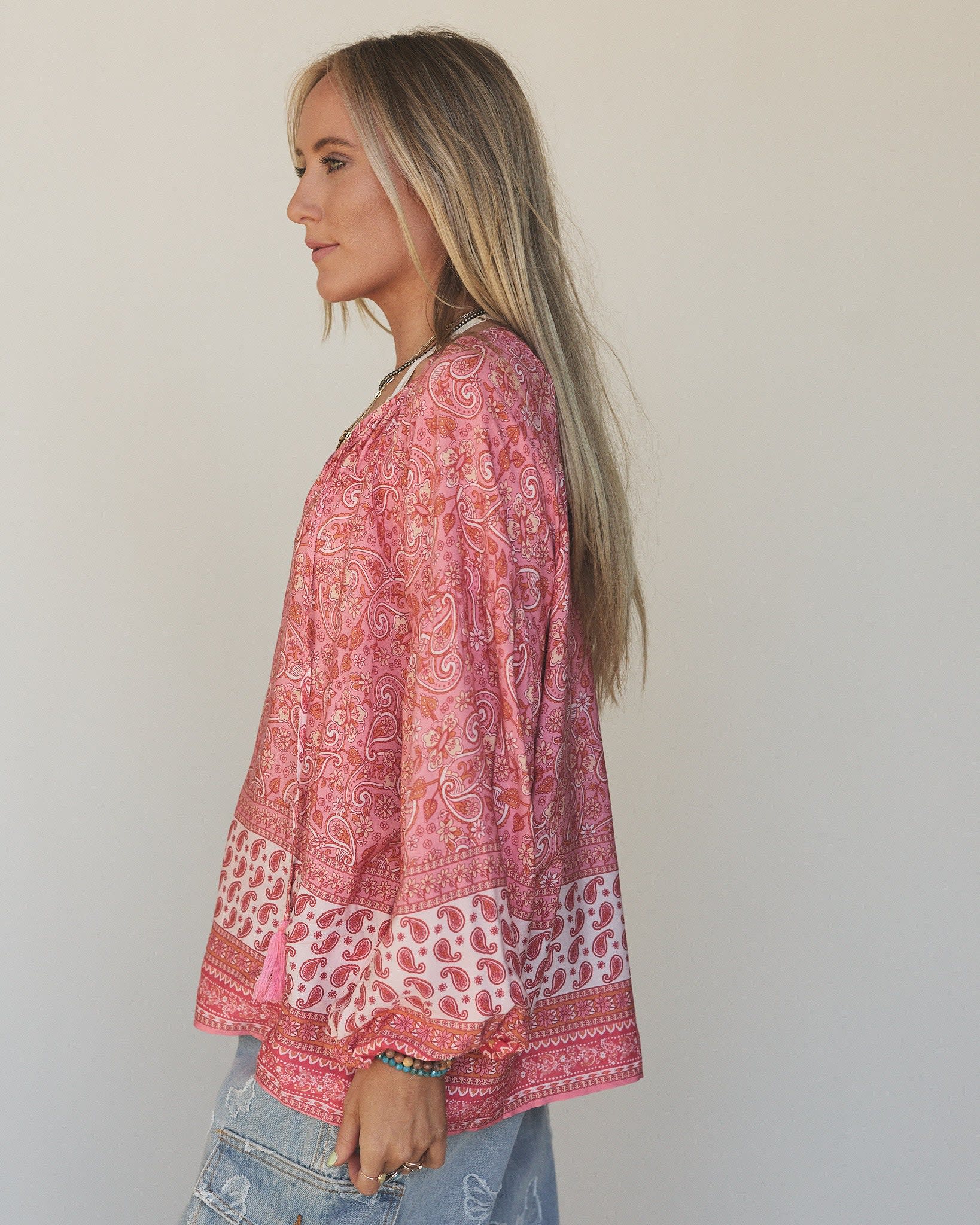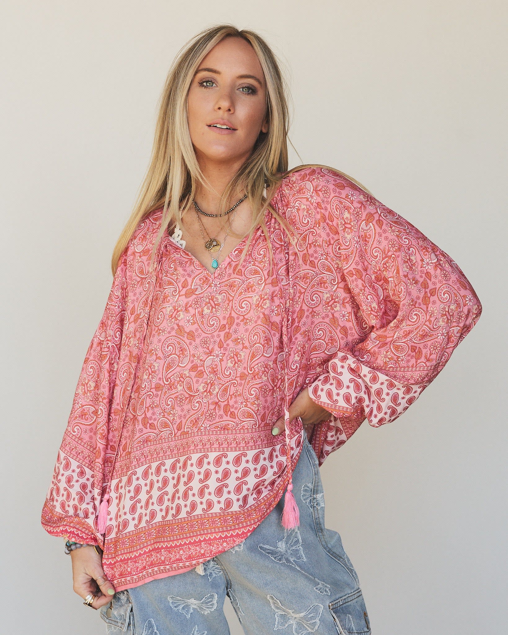 • The Nest Lani Border Print Top: Flowy and lightweight with a dreamy pink paisley print and tassel ties at the hem