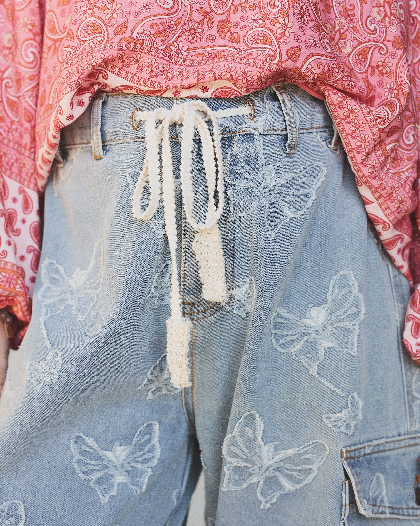 • Washed denim with allover embroidered butterfly detail—soft yet striking