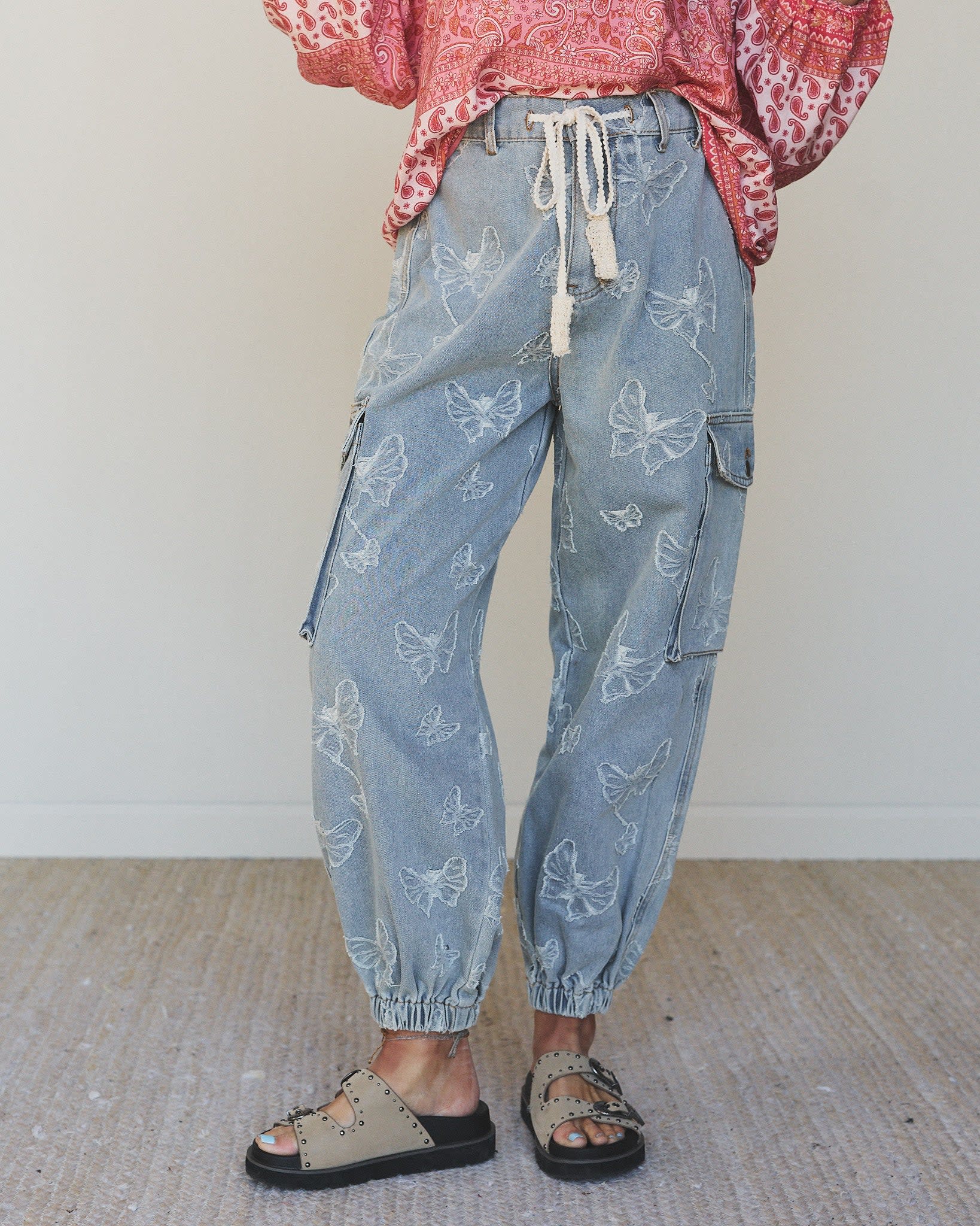 Made for slow mornings at the farmers market or dancing under the stars at your next outdoor show, these denim joggers bring effortless charm to every moment.