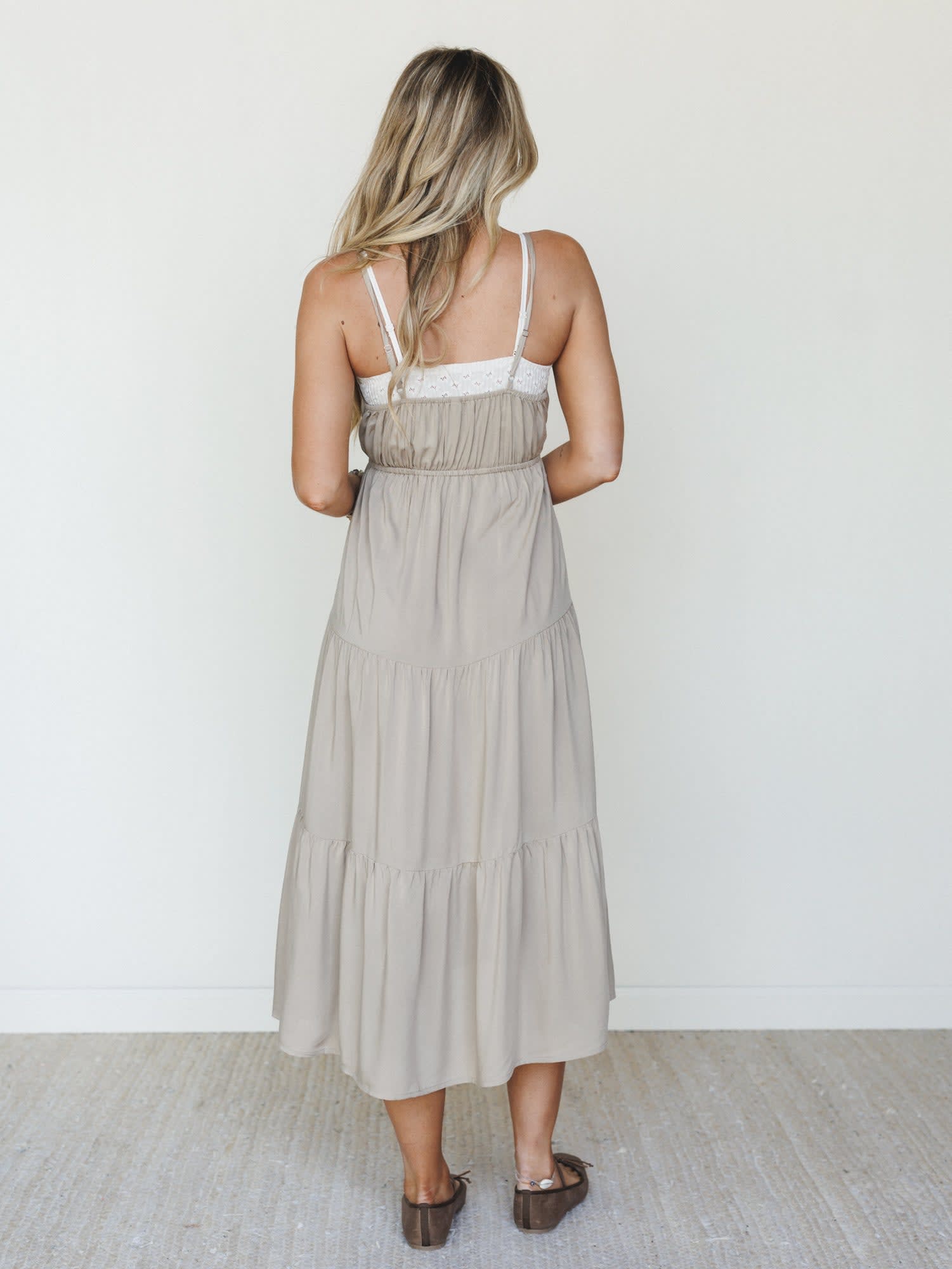 • Lightweight, airy fabric in a versatile neutral that layers beautifully under a boho kimono or denim jacket for cooler evenings.