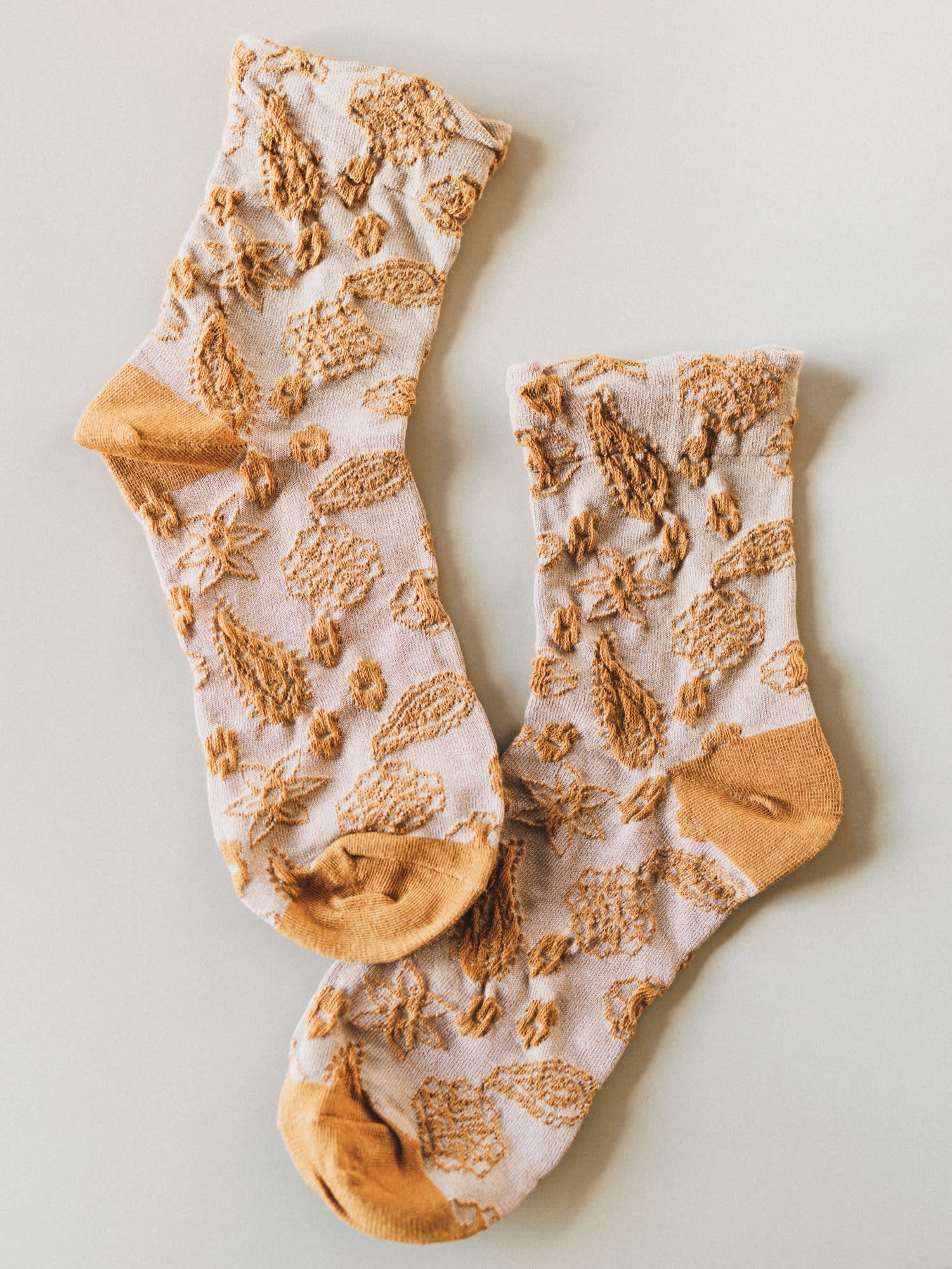 • Walking On Roses Socks: Mustard floral knit socks that add a whimsical boho twist to your loungewear look