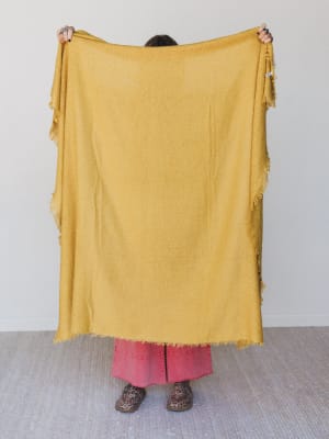 - Mustard yellow hue with raw fringe edges for a rustic finish