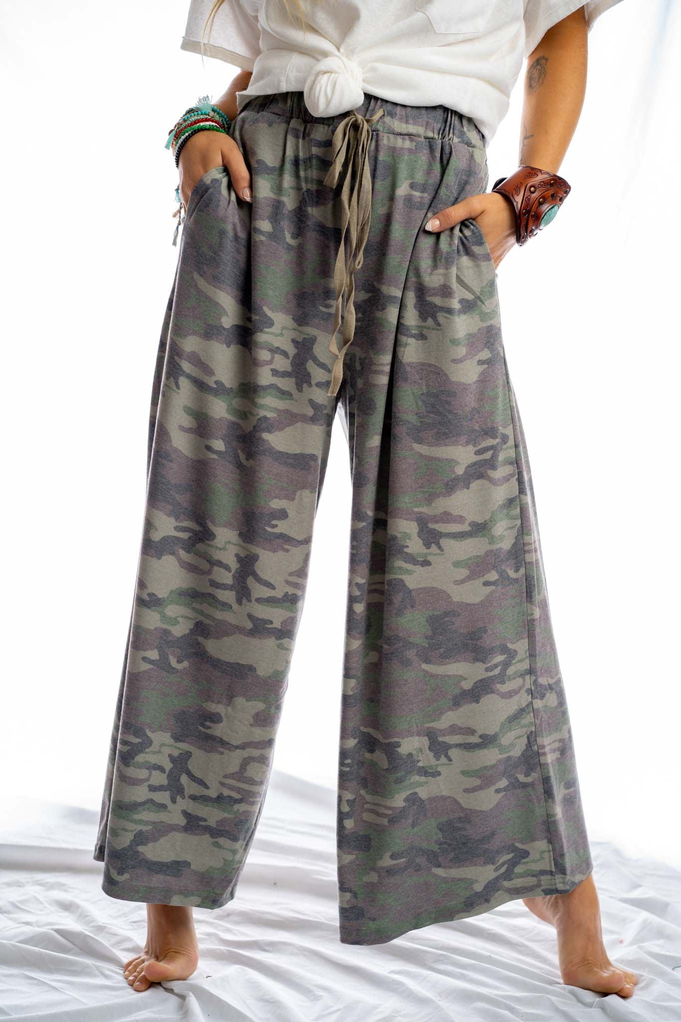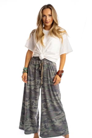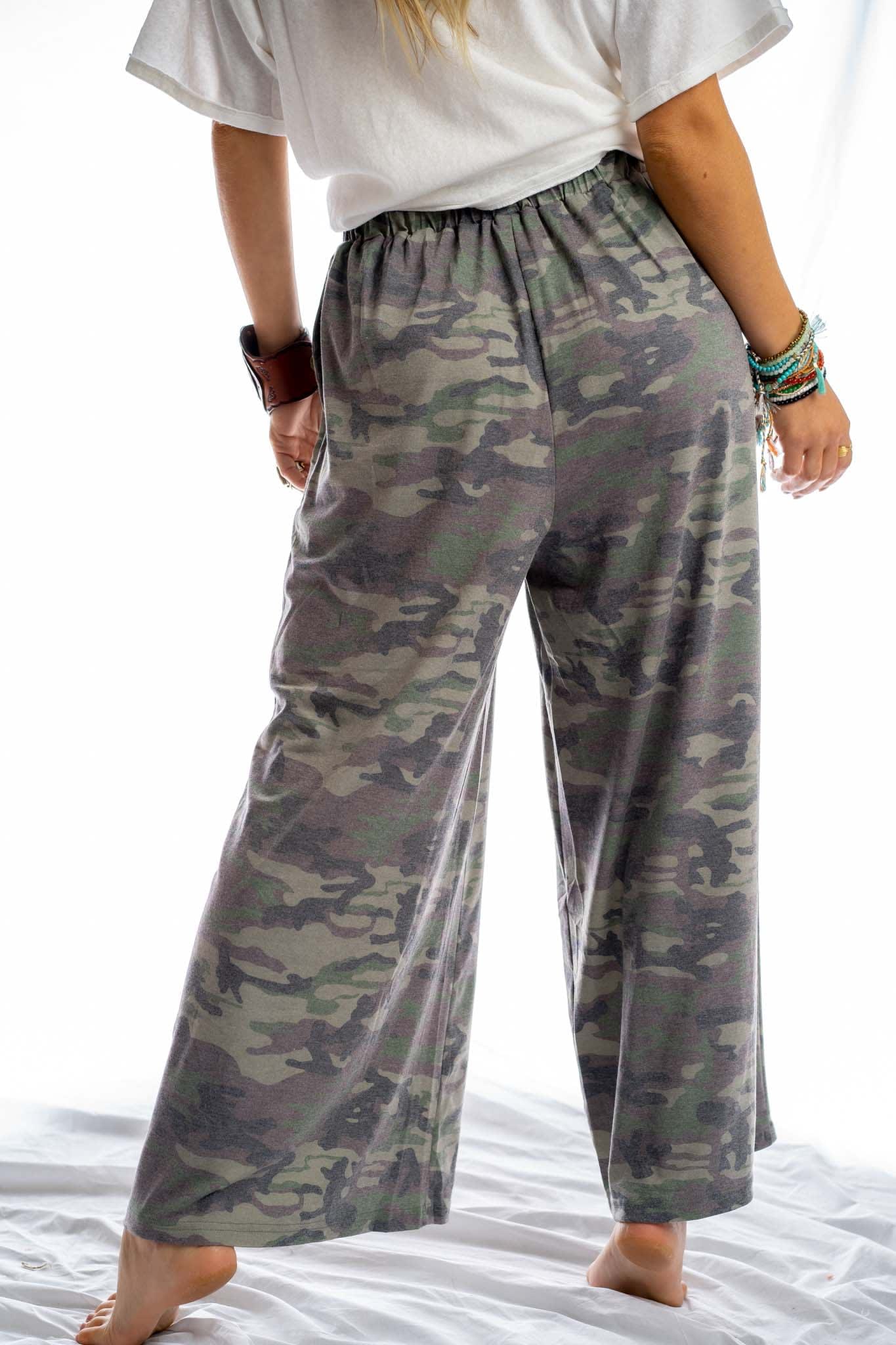 We've got you covered with our Calling All Camo pants! This lounge pant features a washed camouflage print in a wide leg silhouette, a drawstring waistband and pockets. Style them with a classic white tee or our Calling All Camo Lounge TopΒ for a comfy and coolΒ matching set!