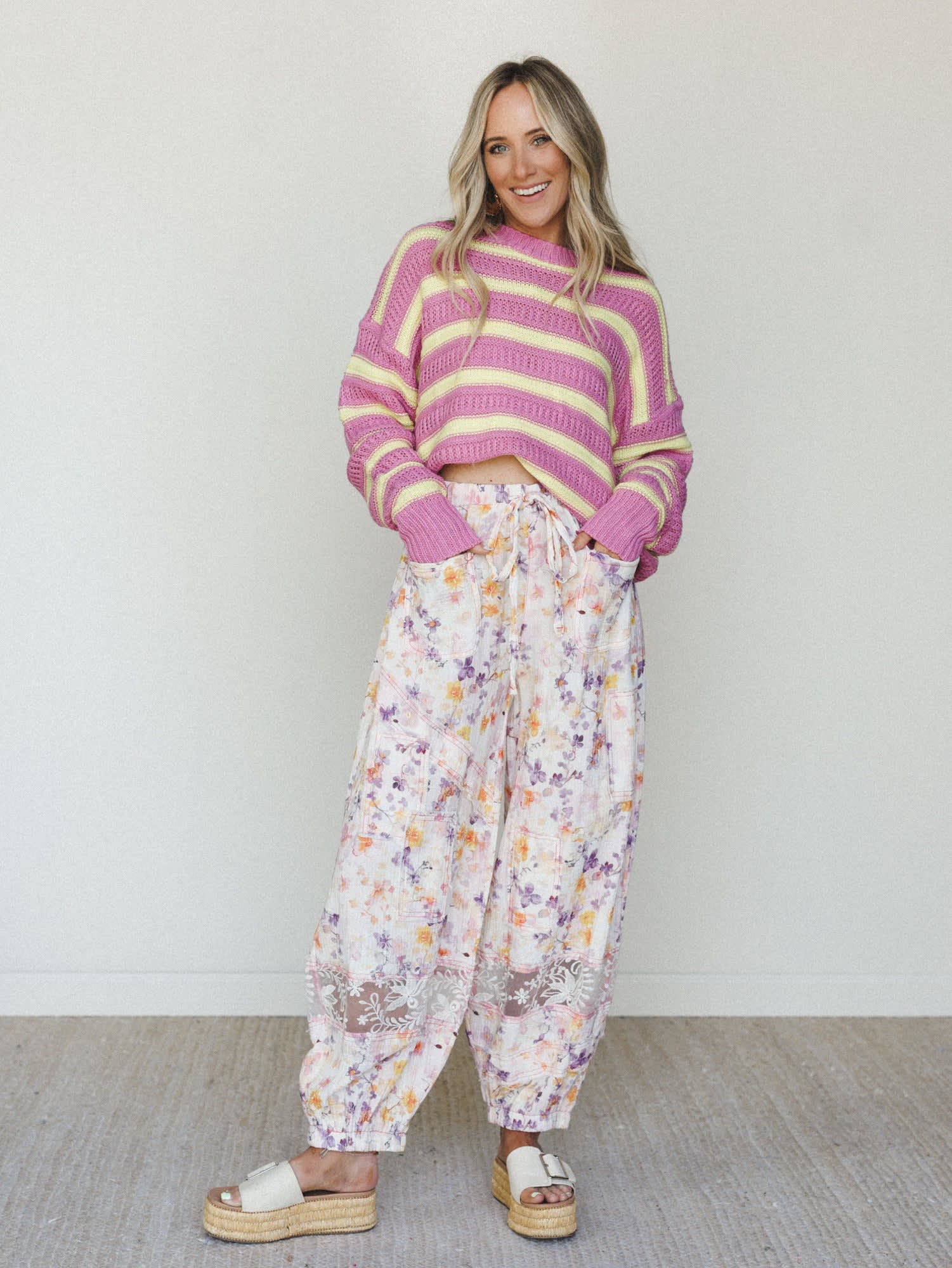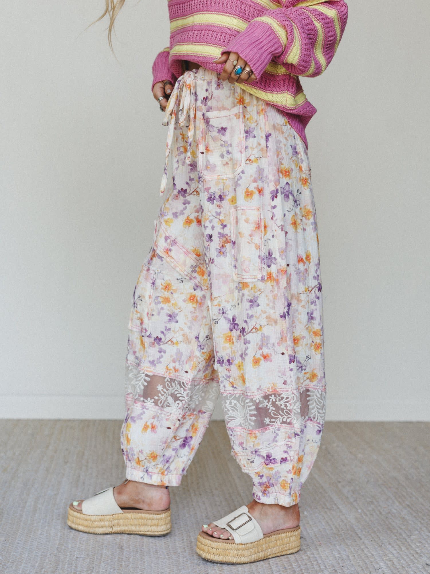 - The Calm Waves Pants bring the dream — a relaxed balloon-leg silhouette in a lightweight gauze with a purple, yellow, and orange floral watercolor print, sheer white embroidered lace hem panel, and a smocked drawstring waist.