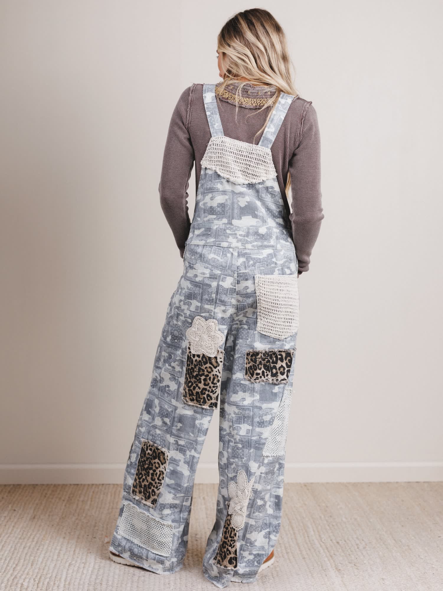 - Features a soft camo print base with standout patchwork including lace, crochet, and leopard