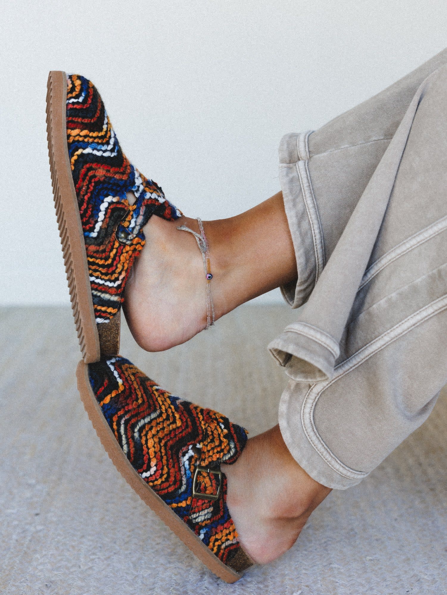 - Textured woven upper in orange, blue, black, and cream adds a unique boho shoe vibe.