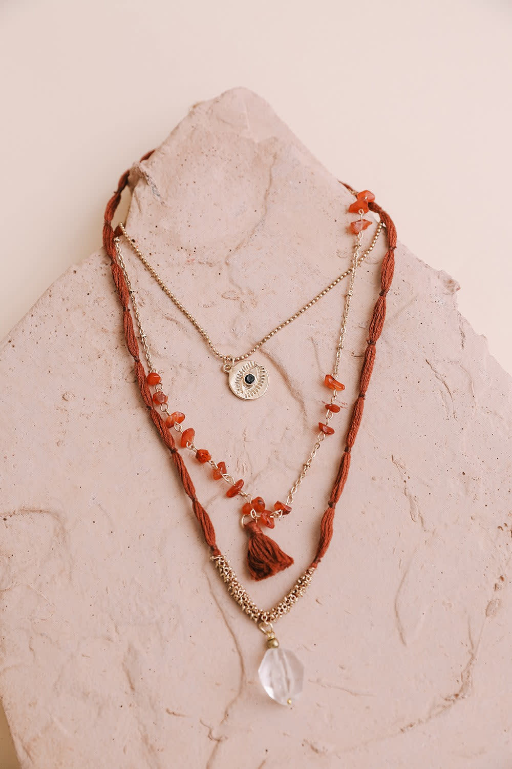 The Carnelian Multi Layered Necklace gives the perfect boho touch to any outfit! It's a classic 3 layer design including chains, rope, various pendants, and beads - so cute, so boho, it's a must!