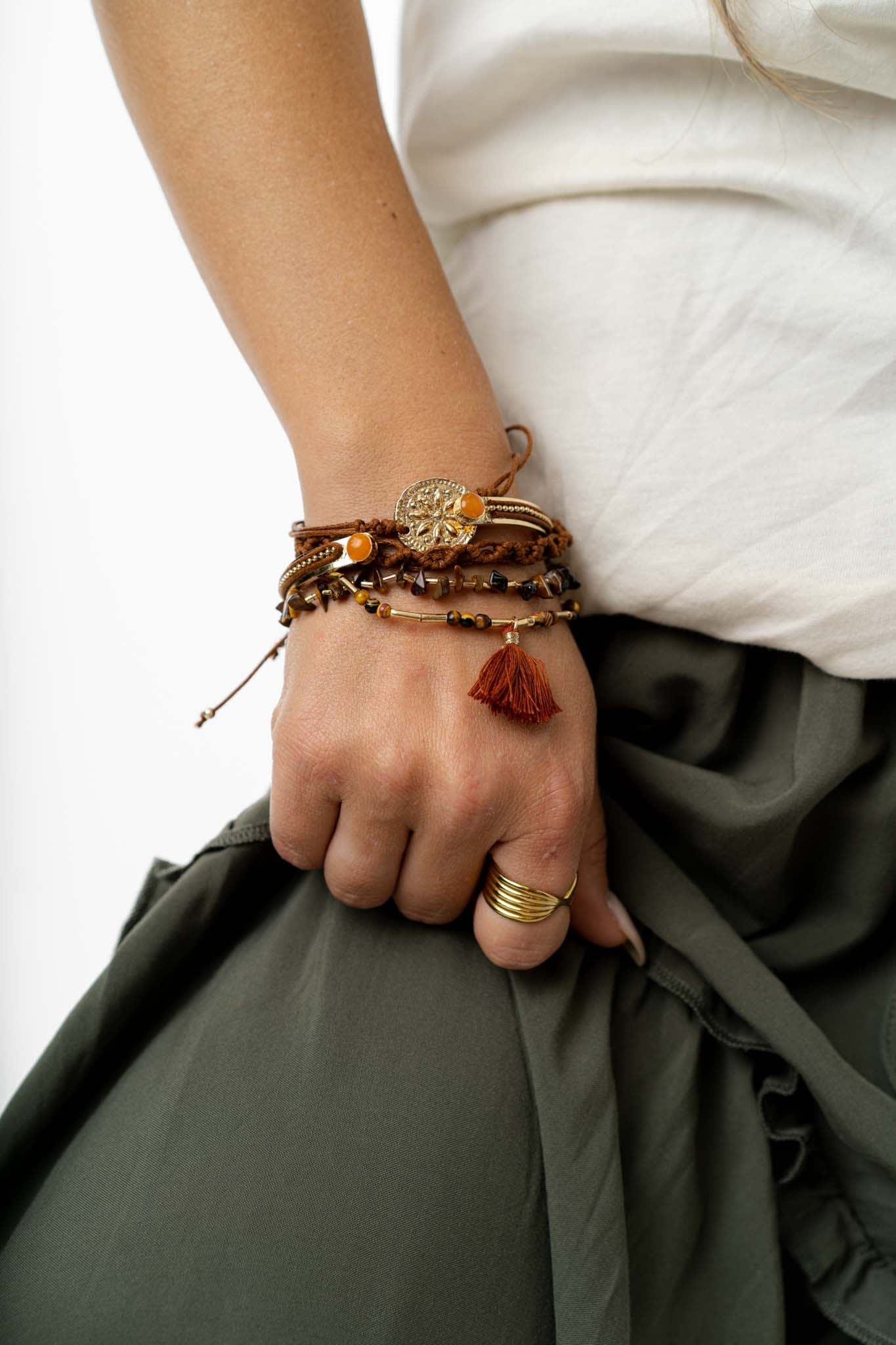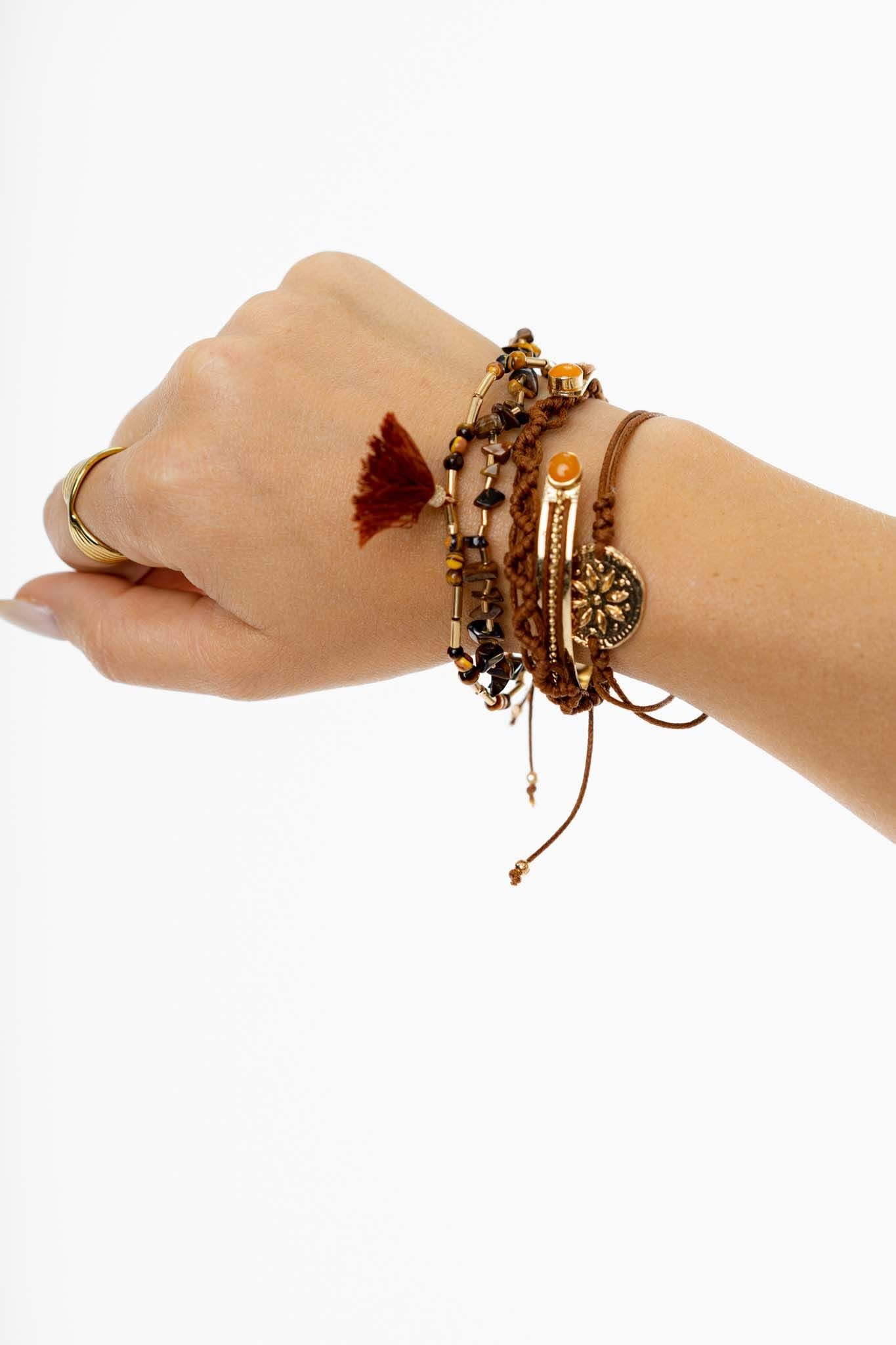 You can never own too many bracelet sets and the Carson Charmed Bracelet Set is the perfect option to add to or start your collection! We know you'll love it because it's a set of five hand made bracelets with boho braids, beads, charms, and tassels - you'll want to pair it with all of your favorite outfits to give them the perfect boho touch.