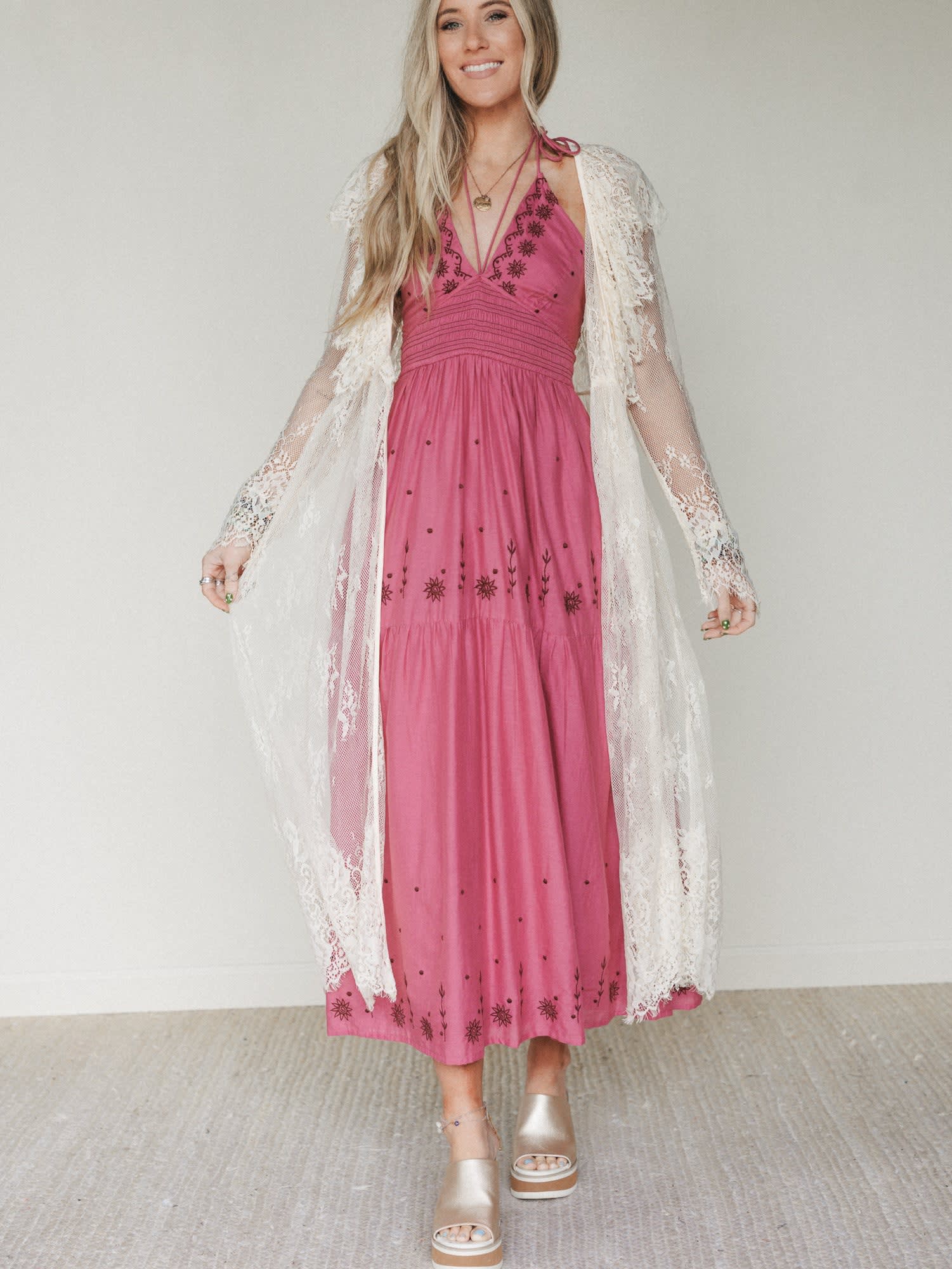 Nothing says effortless boho romance quite like a flowy maxi and lace layers—especially when you’re deciding what to wear to a beach dinner, summer date night, or sunset festival. This dreamy duo pairs a rich rose pink embroidered dress with an airy cream lace duster for a look that feels feminine, floaty, and unforgettable.