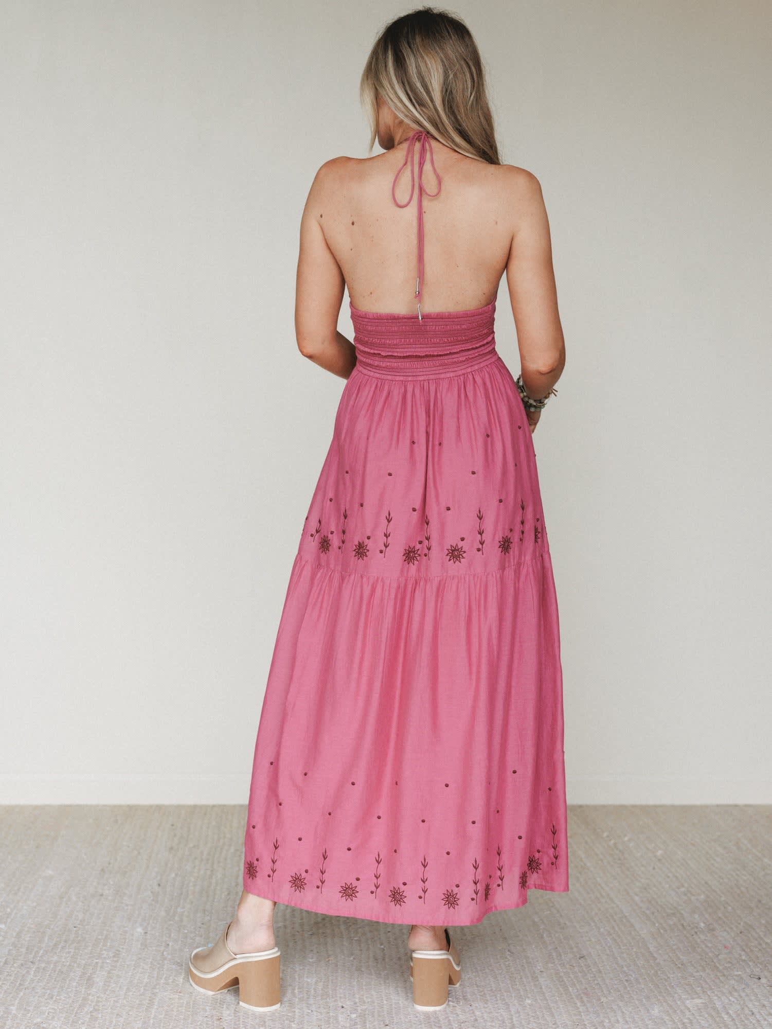 - The Catalina Dress features a flattering halter neckline, embroidered details, and a flowing rose pink maxi silhouette.