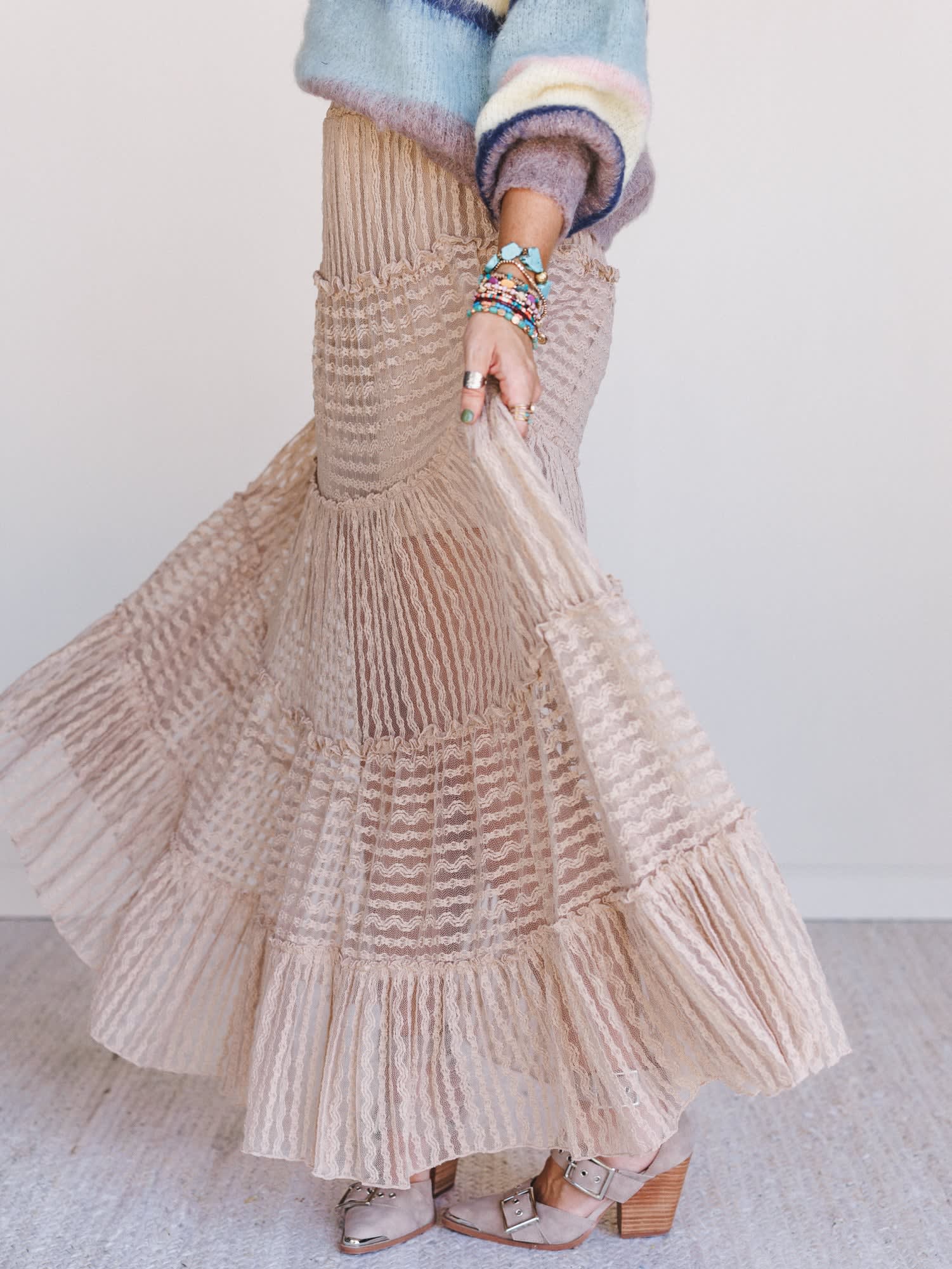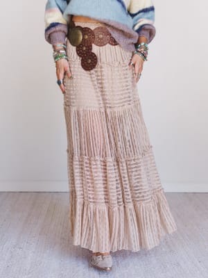 - Sheer tiered maxi skirt with soft texture and boho movement, made for dancing or dreaming