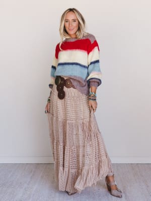 - Fuzzy colorblock sweater in warm, sunset tones with a relaxed fit—your new favorite in womens boho tops