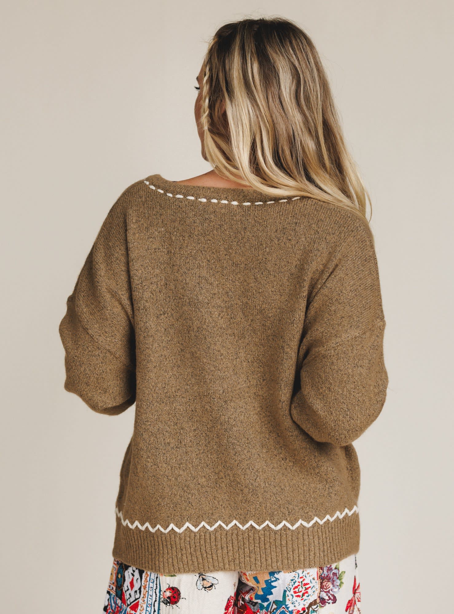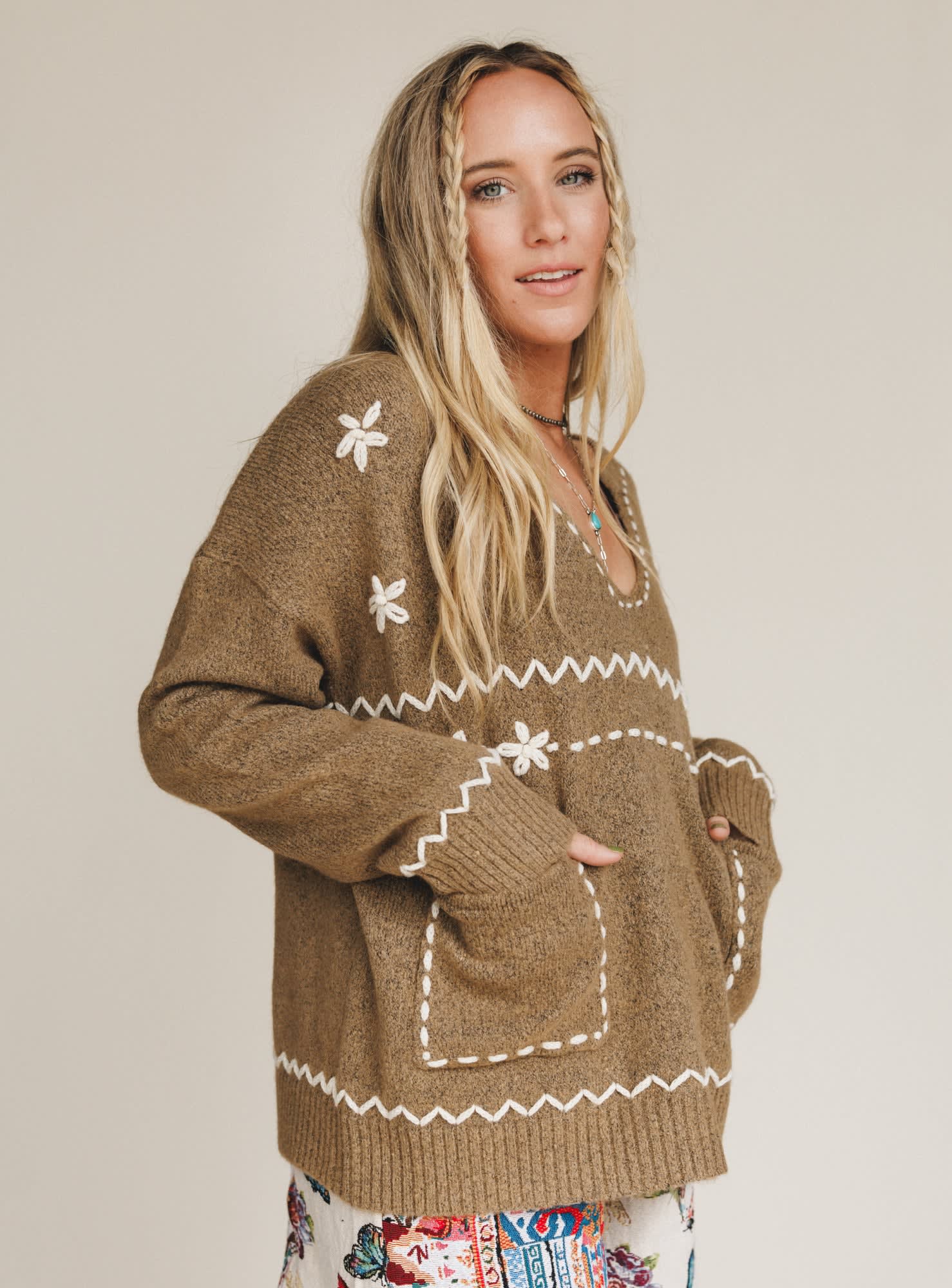 Cozy up with the charm of autumn in the Chai Embroidered Knit Sweater — a timeless piece with delicate details and all the warm, earthy vibes.