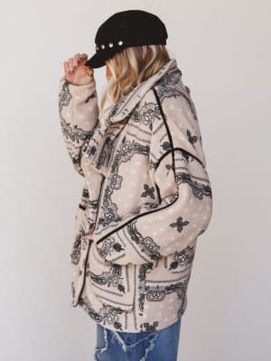 Your new cold-weather obsession has arrived. The Charmed Affair Printed Fleece Jacket brings bold Western vibes to cozy layering with its ultra-soft feel and bandana-inspired print. Toss it on over distressed denim and boots for a dreamy, laid-back look.