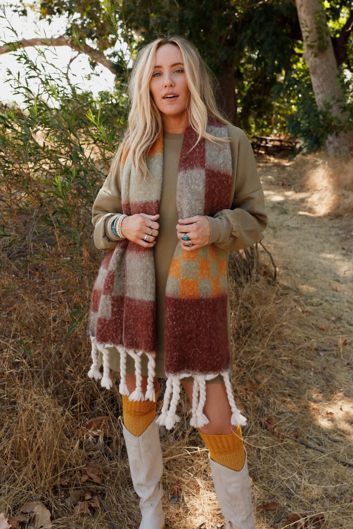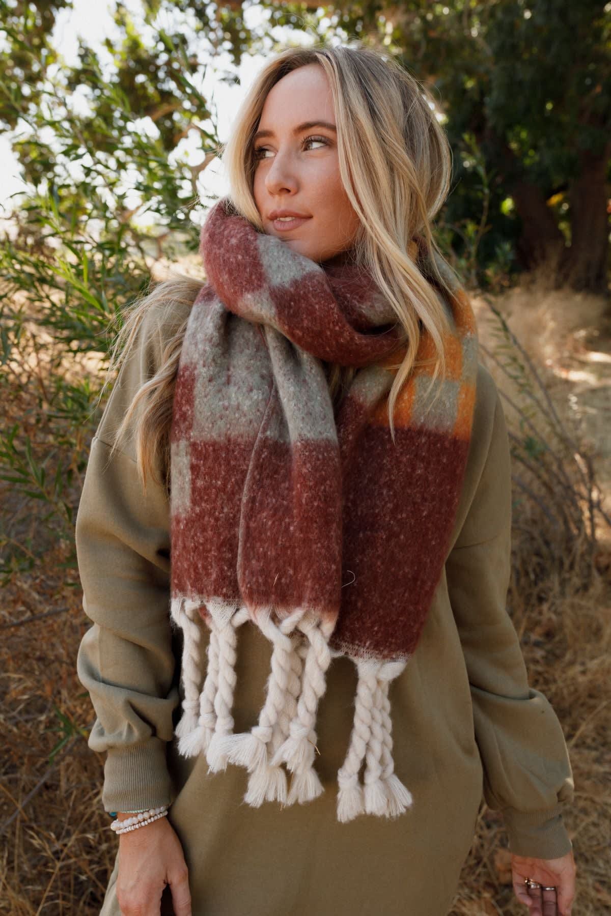 Cozy on up in the Check Me Out Tassel Scarf! You're going to love wearing it with all of your favorite outfits because it features: