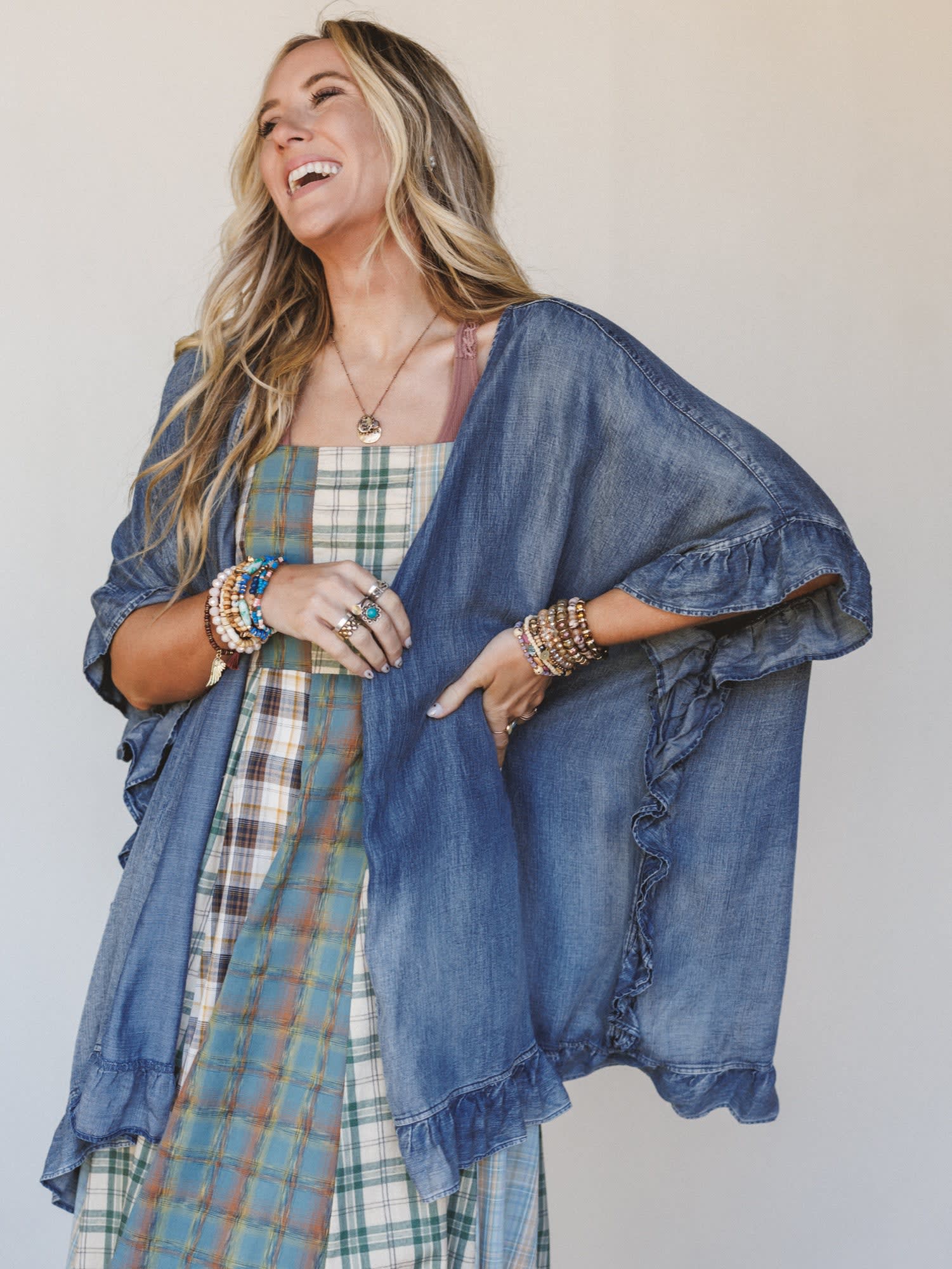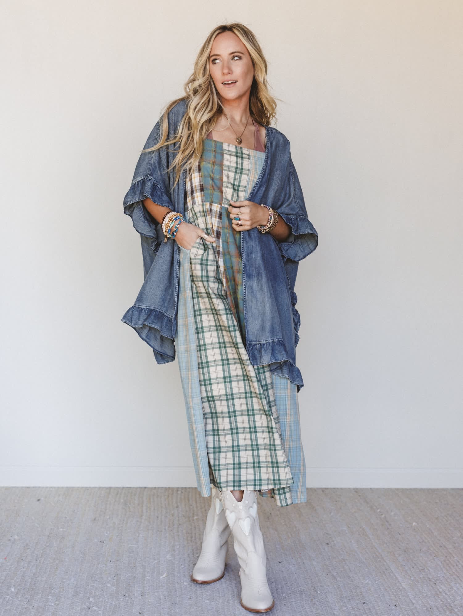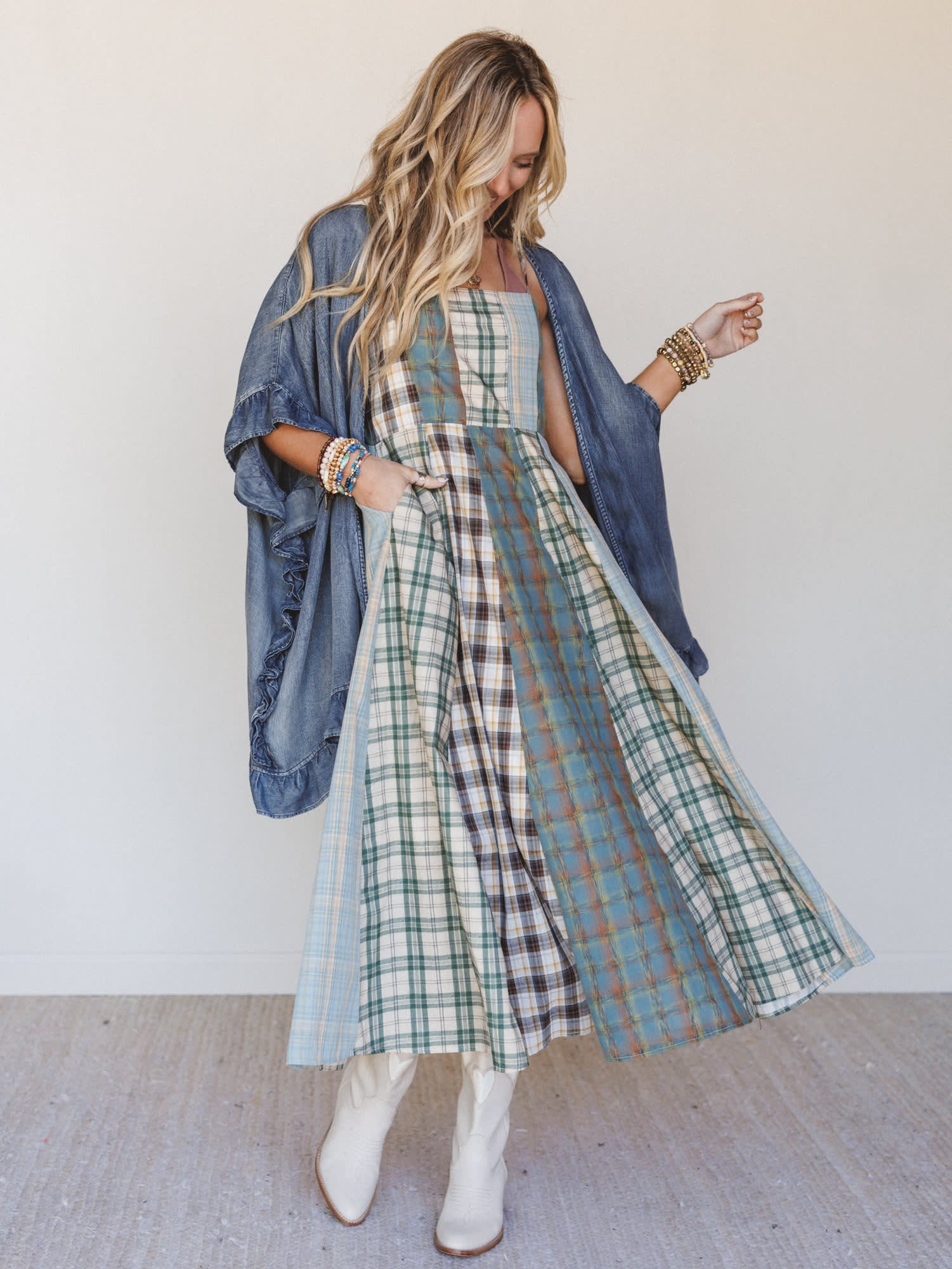 Made for country concert nights, weekend markets, and those “what to wear with cowboy boots” moments, this 2 piece western outfit blends effortless charm with a laid-back boho feel. Featuring a flowy Multi Plaid dress and a relaxed Denim Blue jacket, it’s the kind of look that feels styled without trying.