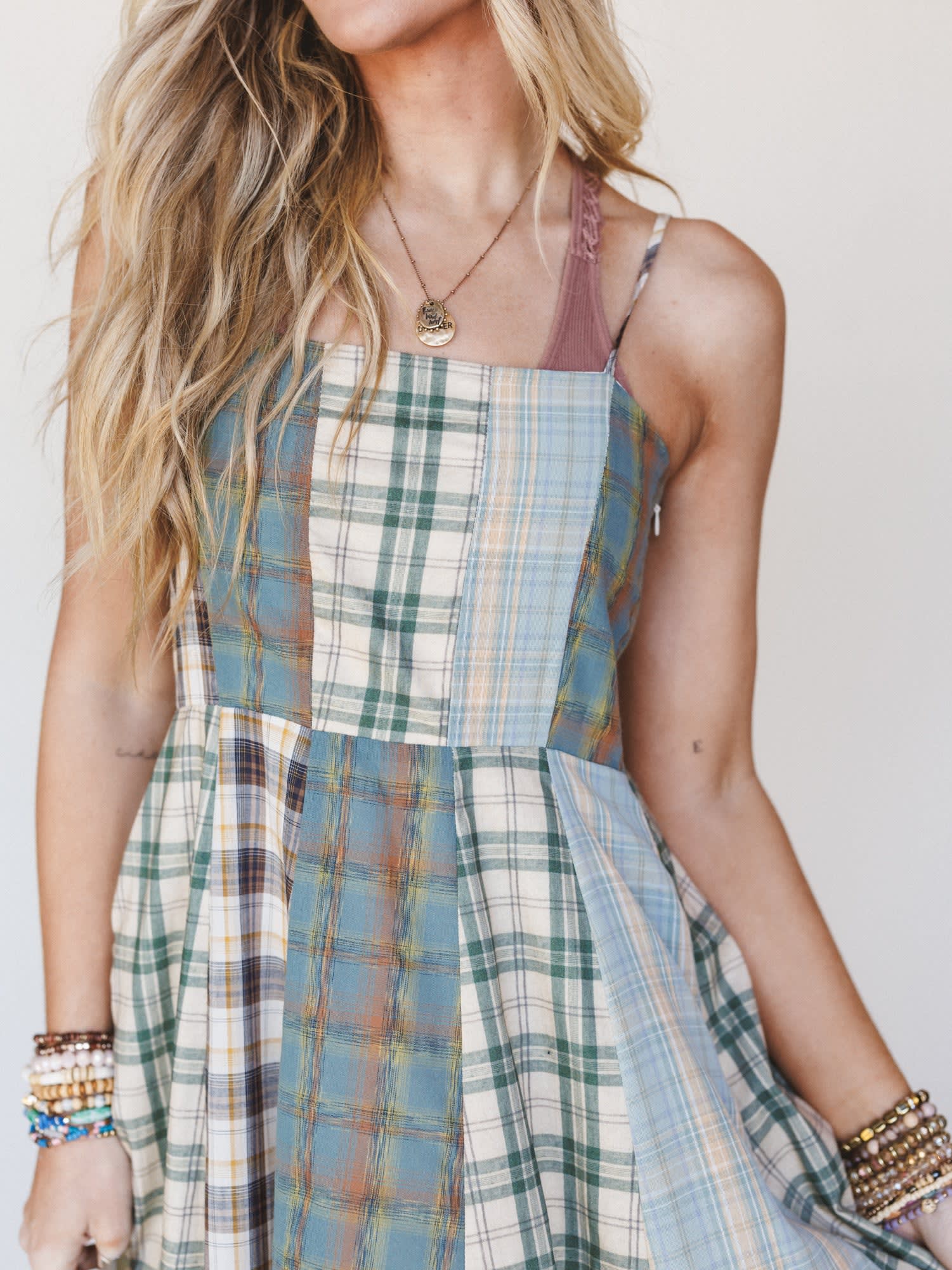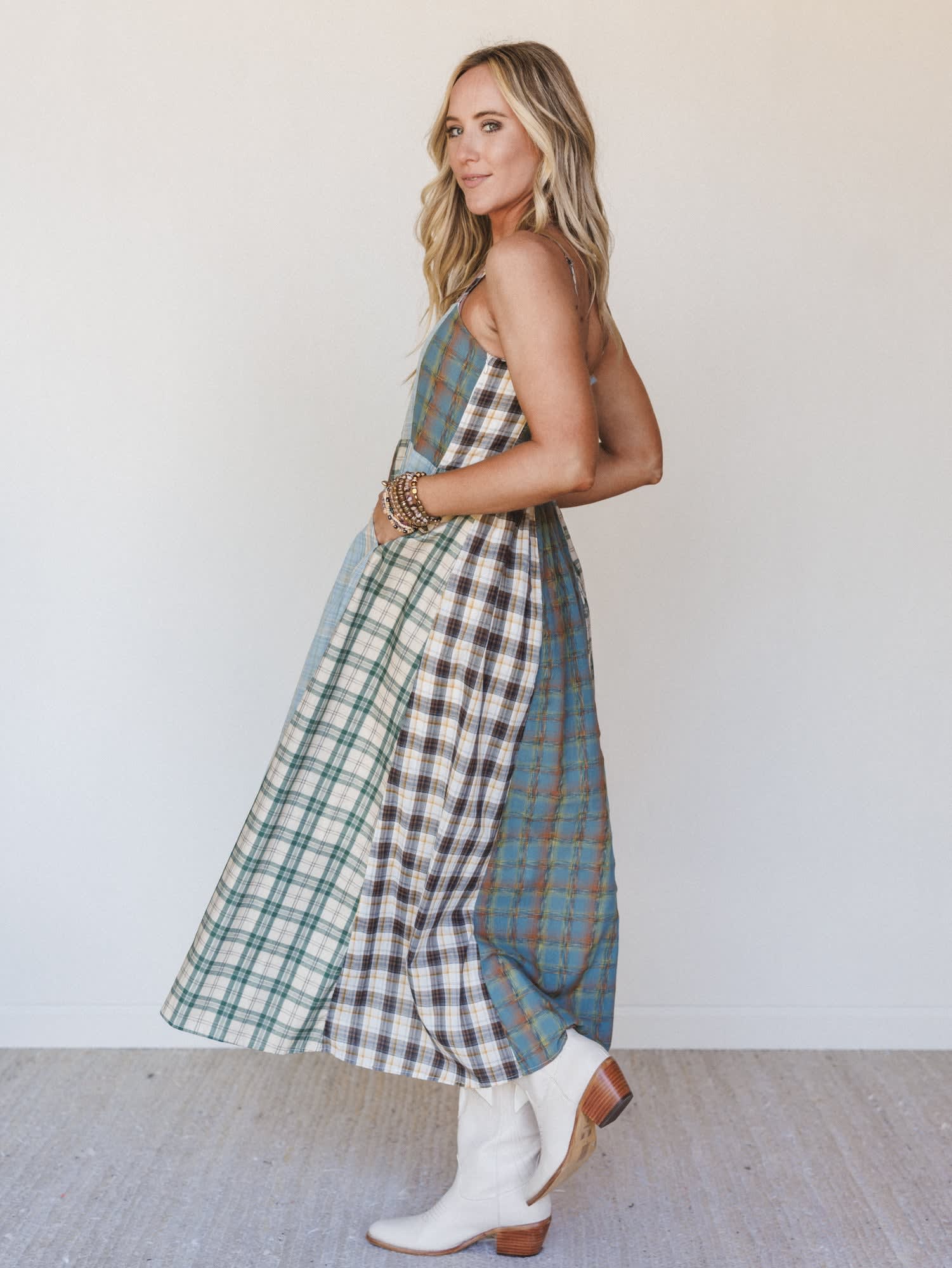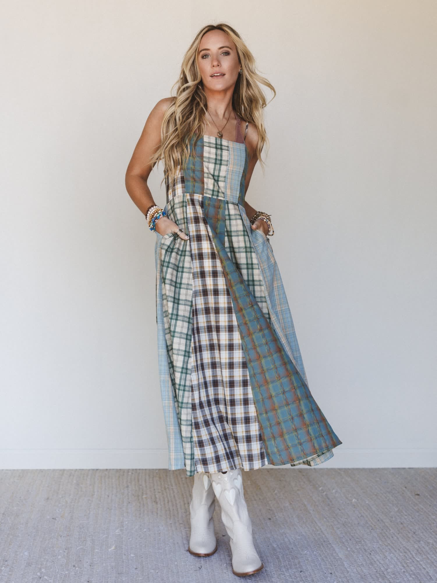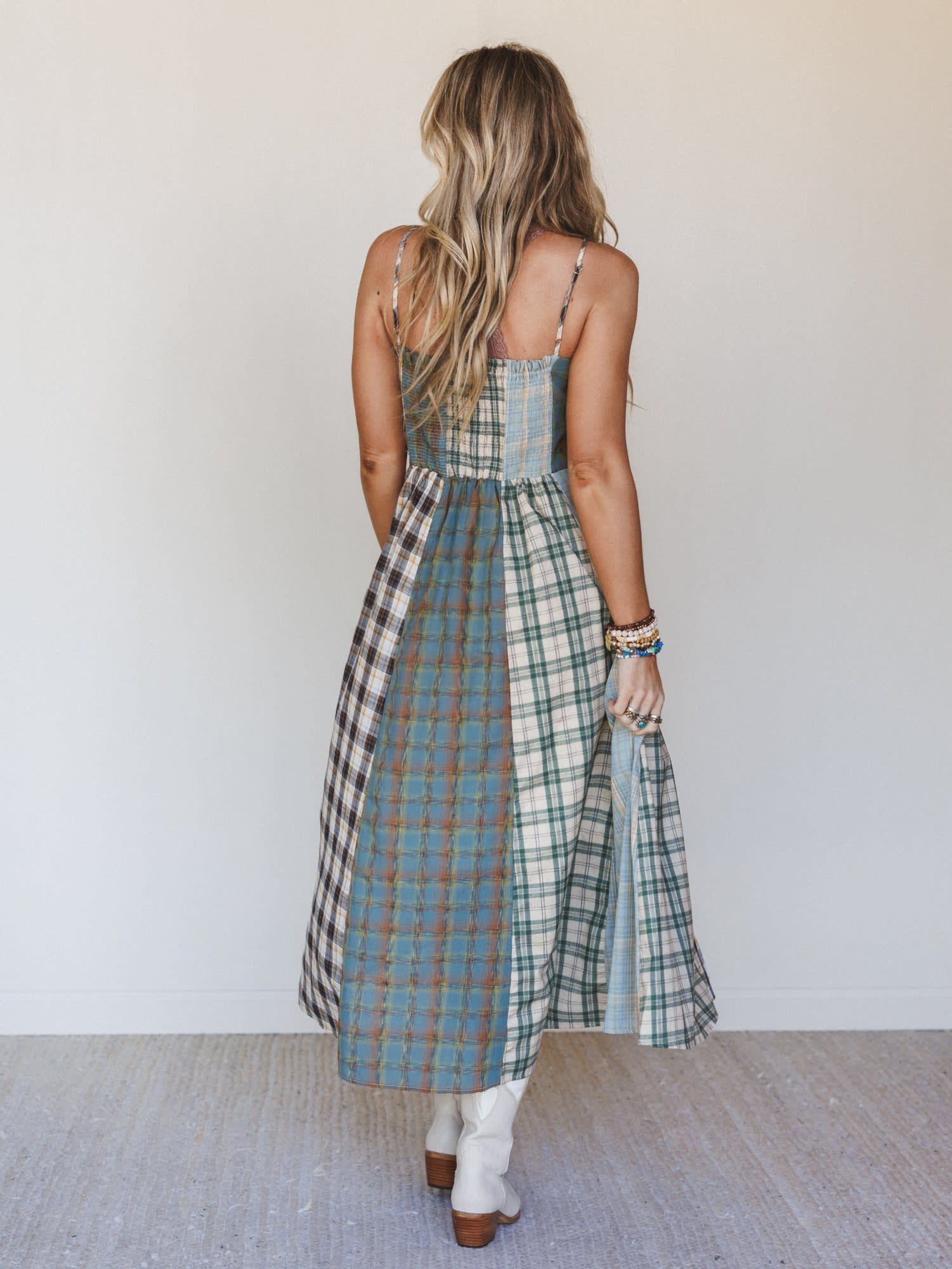 - The Western Charm Checkered Dress features a patchwork plaid design with a flowy midi length that gives this western boho dress an easy, feminine silhouette.