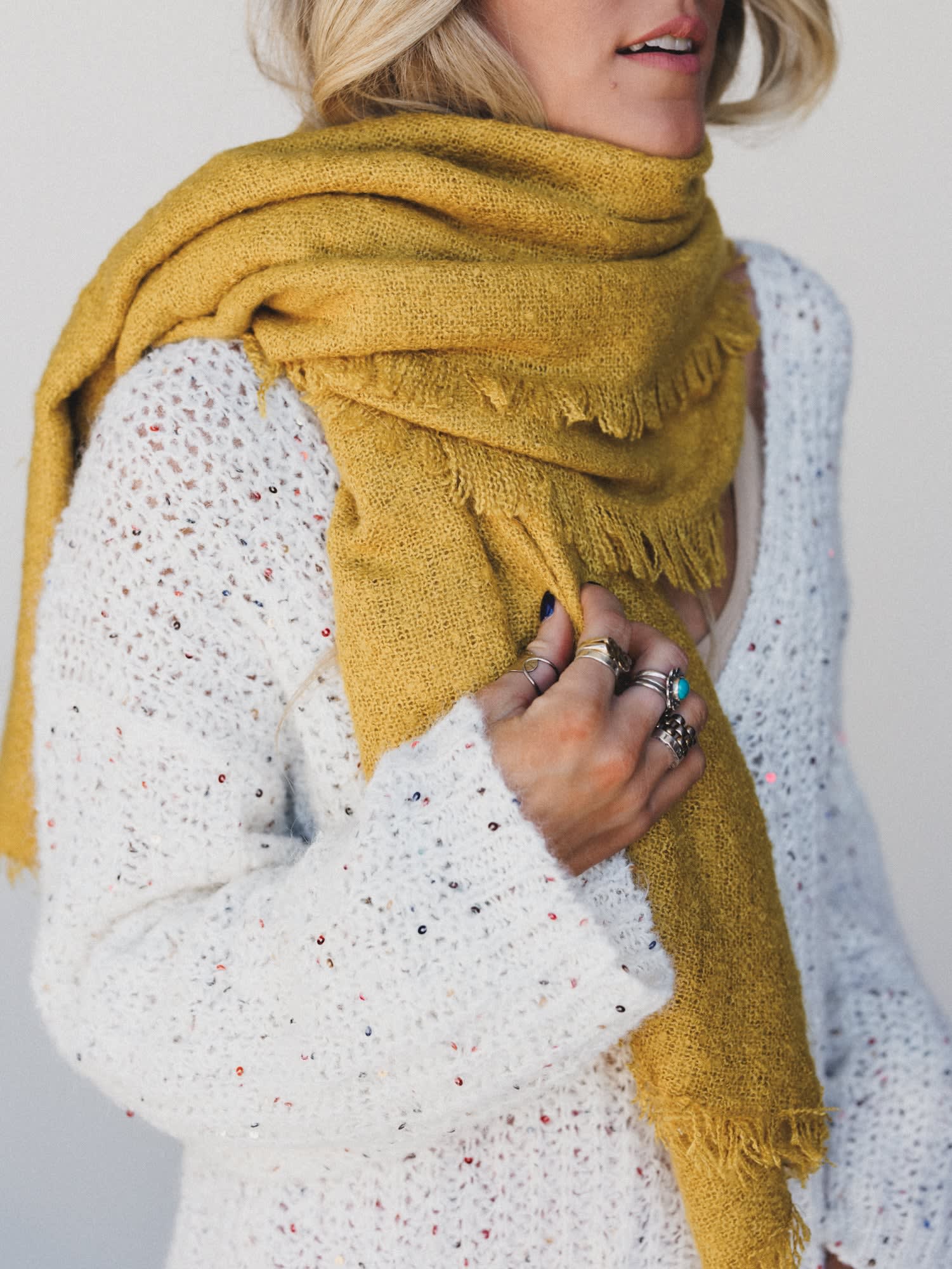 - Cabin Calling Blanket Scarf – In a golden mustard hue, this oversized scarf adds just the right pop of color—and warmth—for layering through fall and winter.