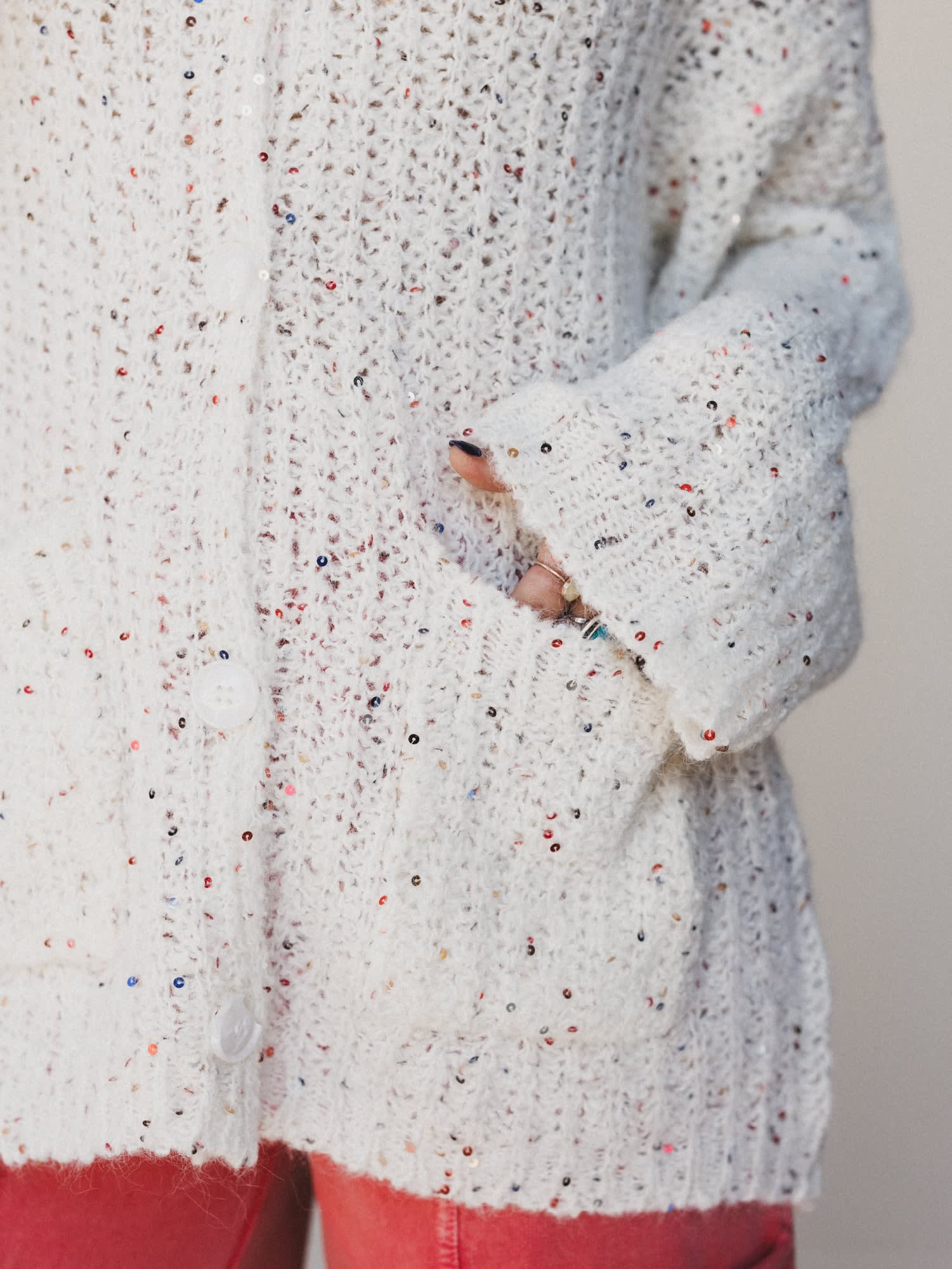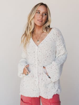 - Cloud Snug Cardigan – The chunky knit and speckled yarn give it that handmade-with-love feel, while oversized pockets and a slouchy fit keep things relaxed.