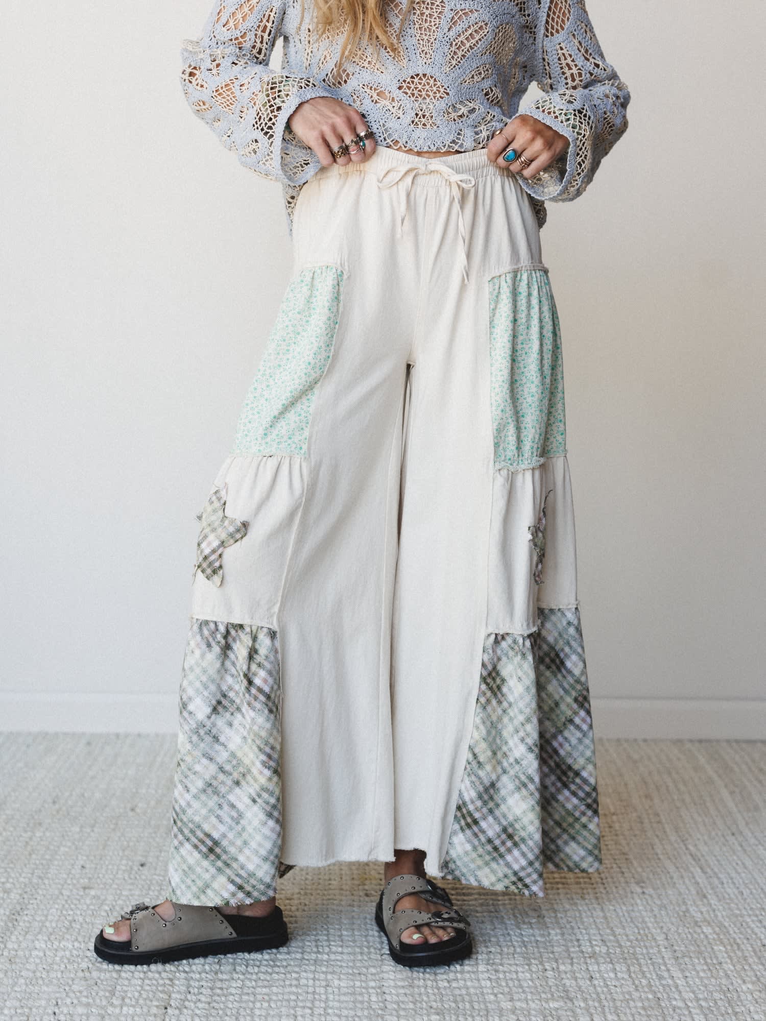 These dreamy boho wide leg pants are perfect for creating those effortless festival outfits that capture your free-spirited style. The relaxed silhouette and artistic patchwork design make these boho pants a standout piece in any bohemian fashion lover's wardrobe.