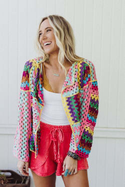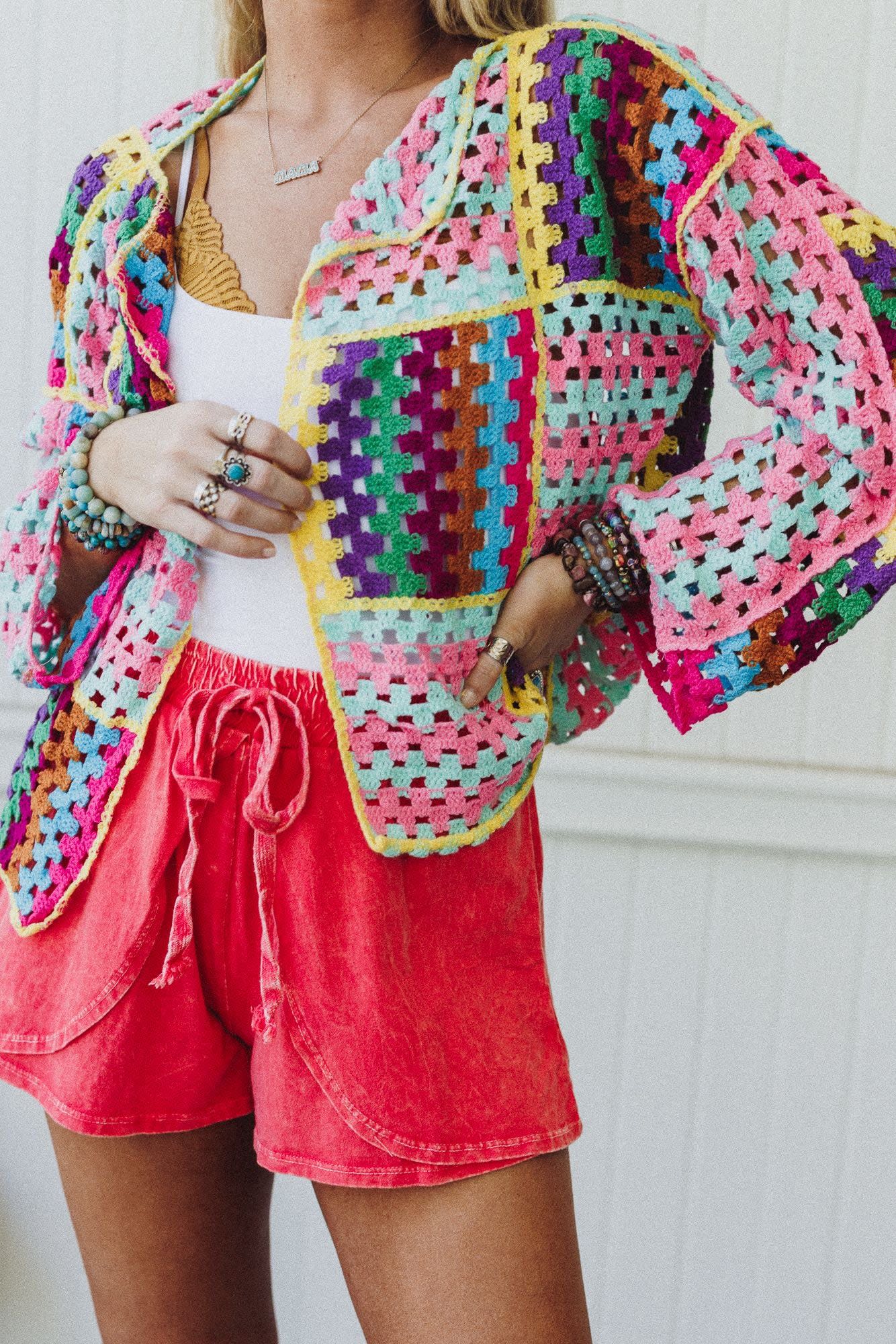 • Colorwaves Crochet Cardigan: A rainbow patchwork of crochet squares with an open front and breezy fit. This cardigan adds instant personality to any look and feels like a wearable piece of joy.