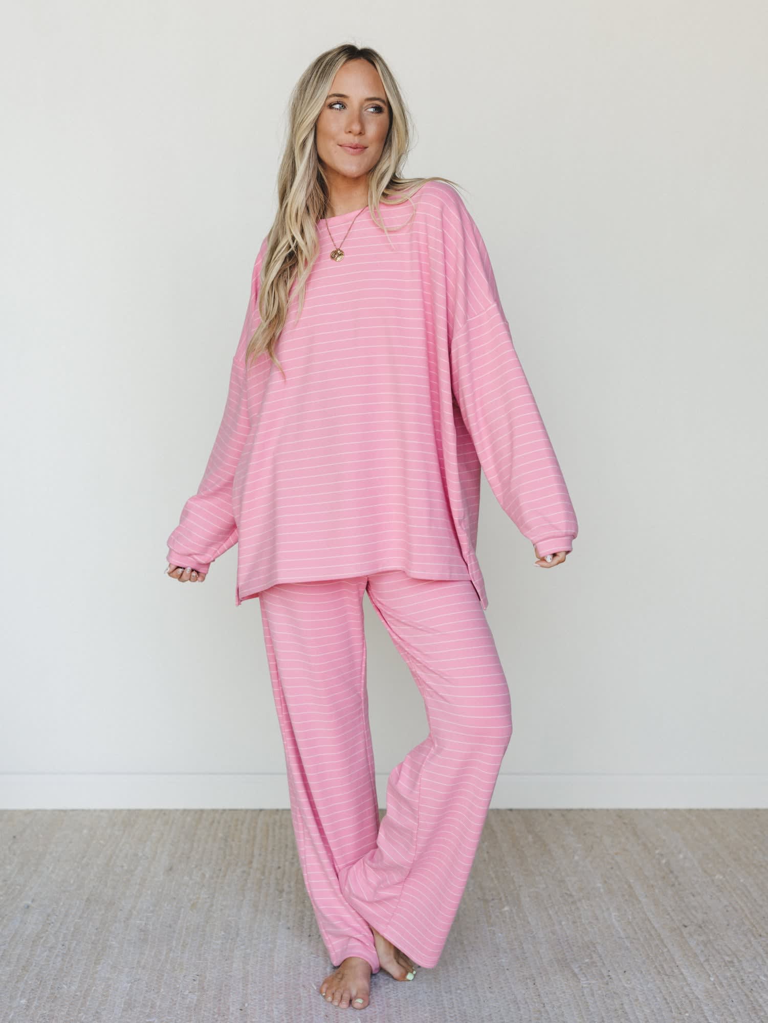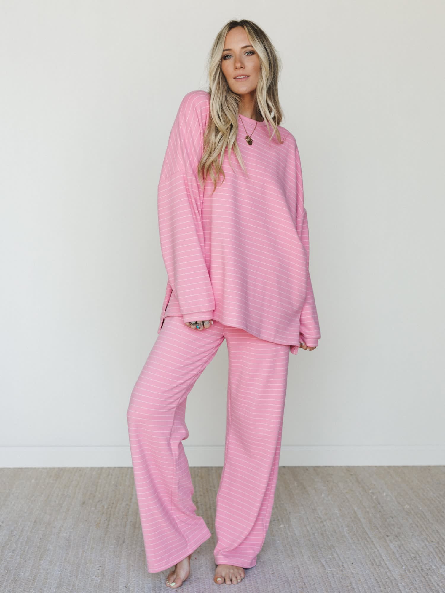 • The Comfort Mode Pants match perfectly with the same pink and white pinstripe in a wide leg silhouette and comfortable elastic waistband — equal parts cozy and polished.