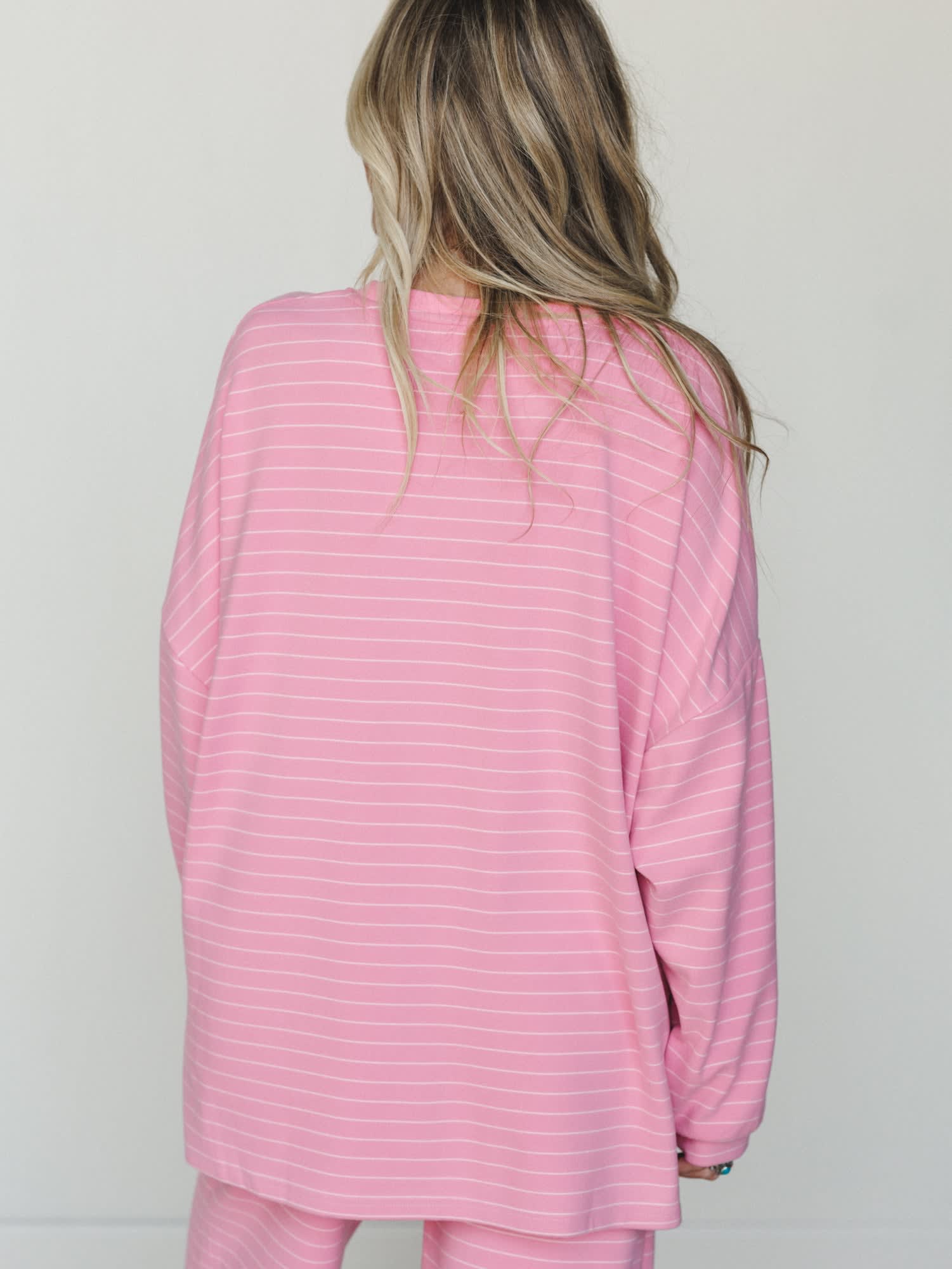 • The Comfort Mode Top is an oversized, drop-shoulder pullover in a soft pink and white pinstripe knit — substantial and smooth with long sleeves and a relaxed crew neck that feels elevated without trying.