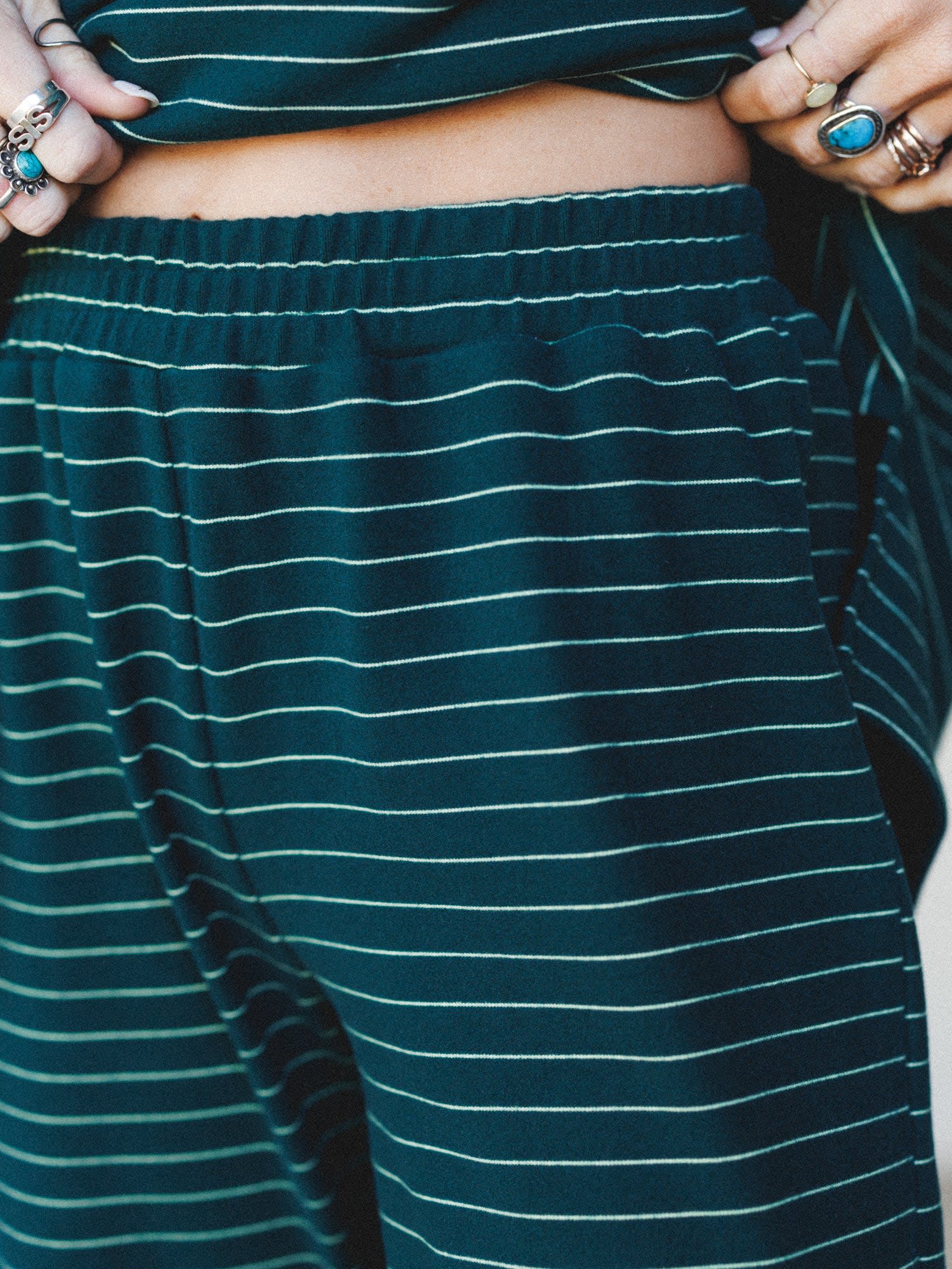 If you’re building the ultimate cozy set or looking for what to wear on a travel day, these are the pants you’ll live in. The relaxed fit and soft deep green with white stripe pattern make them an easy go-to for effortless, laid-back boho style.