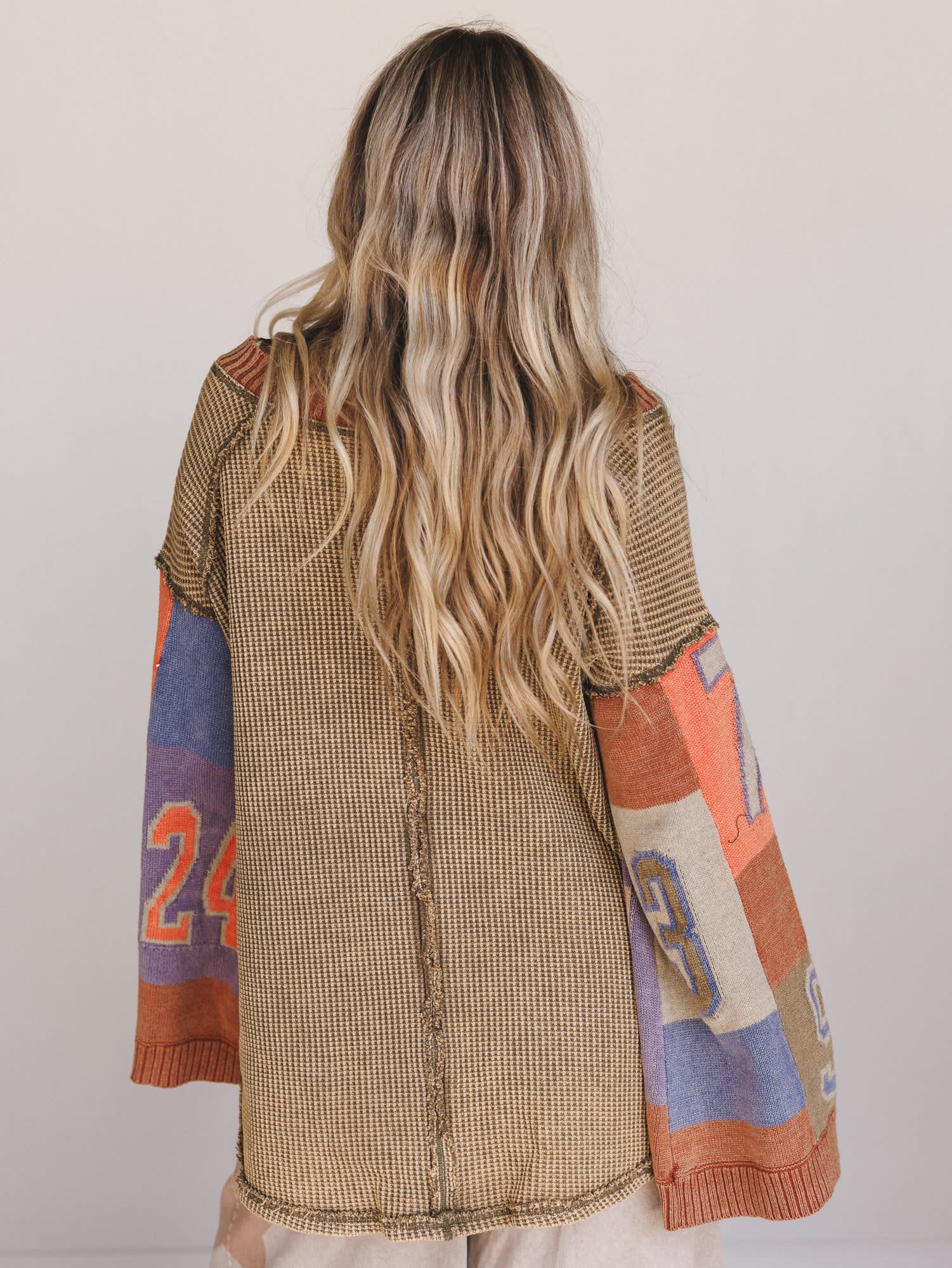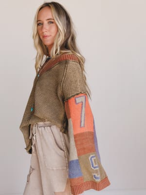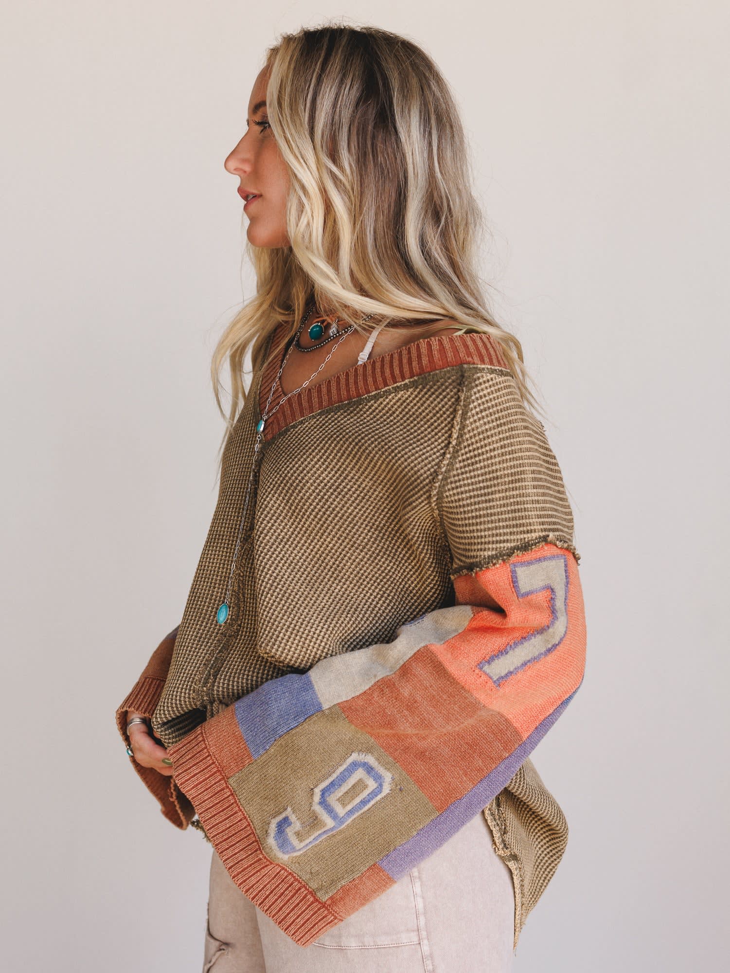 Bold, laid-back, and full of personality—the Cool Tempo V Neck Top is here to turn up the volume on your everyday style. With its patchwork sleeve design and cozy textured knit, this one’s made for the girls who dance to their own beat.