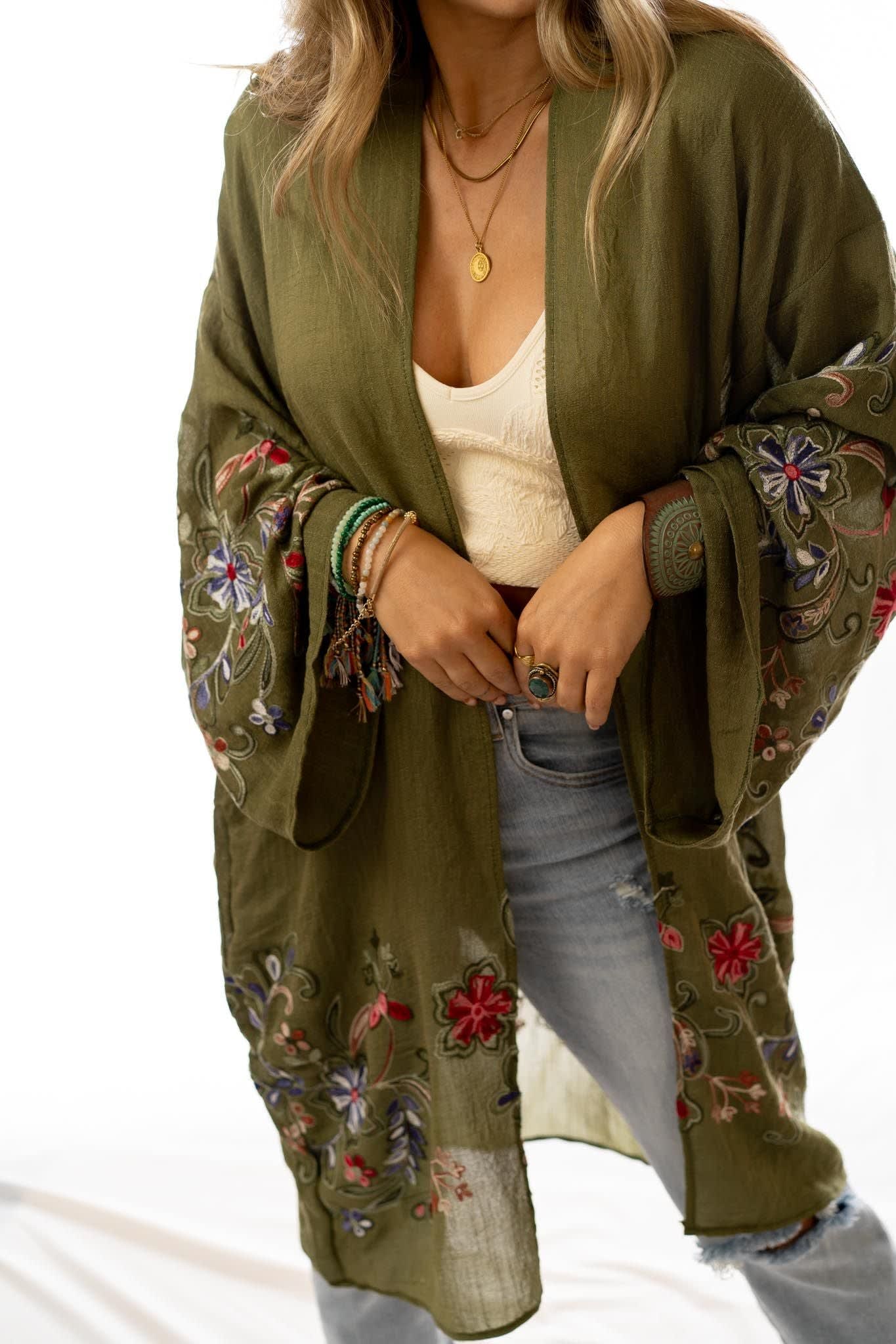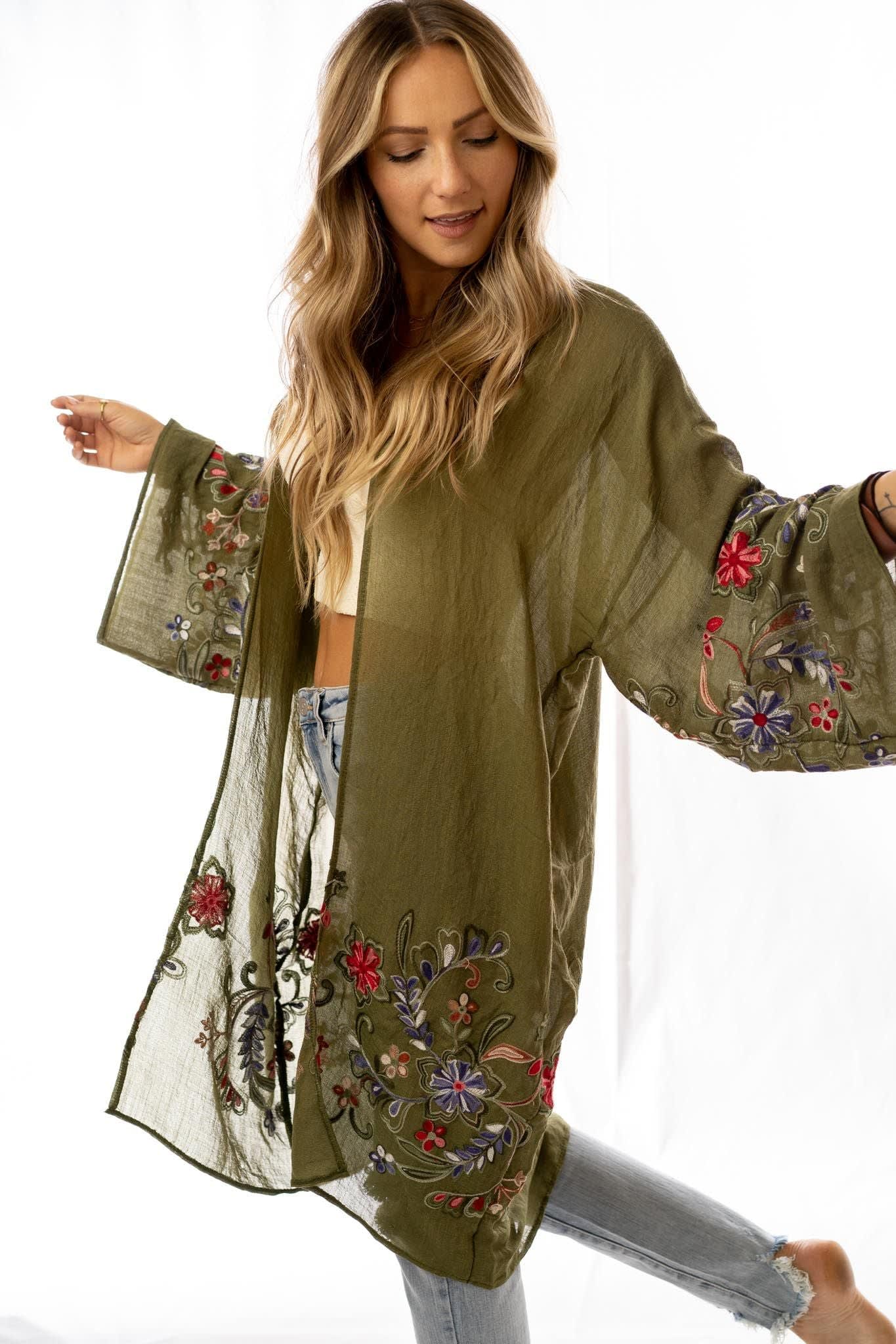 Nothing is more fun than a kimono covered in floral! This perfect layering piece features a sheer fabric in a longline silhouette with accents of crochet florals in multi colors along the hem and wide sleeves!